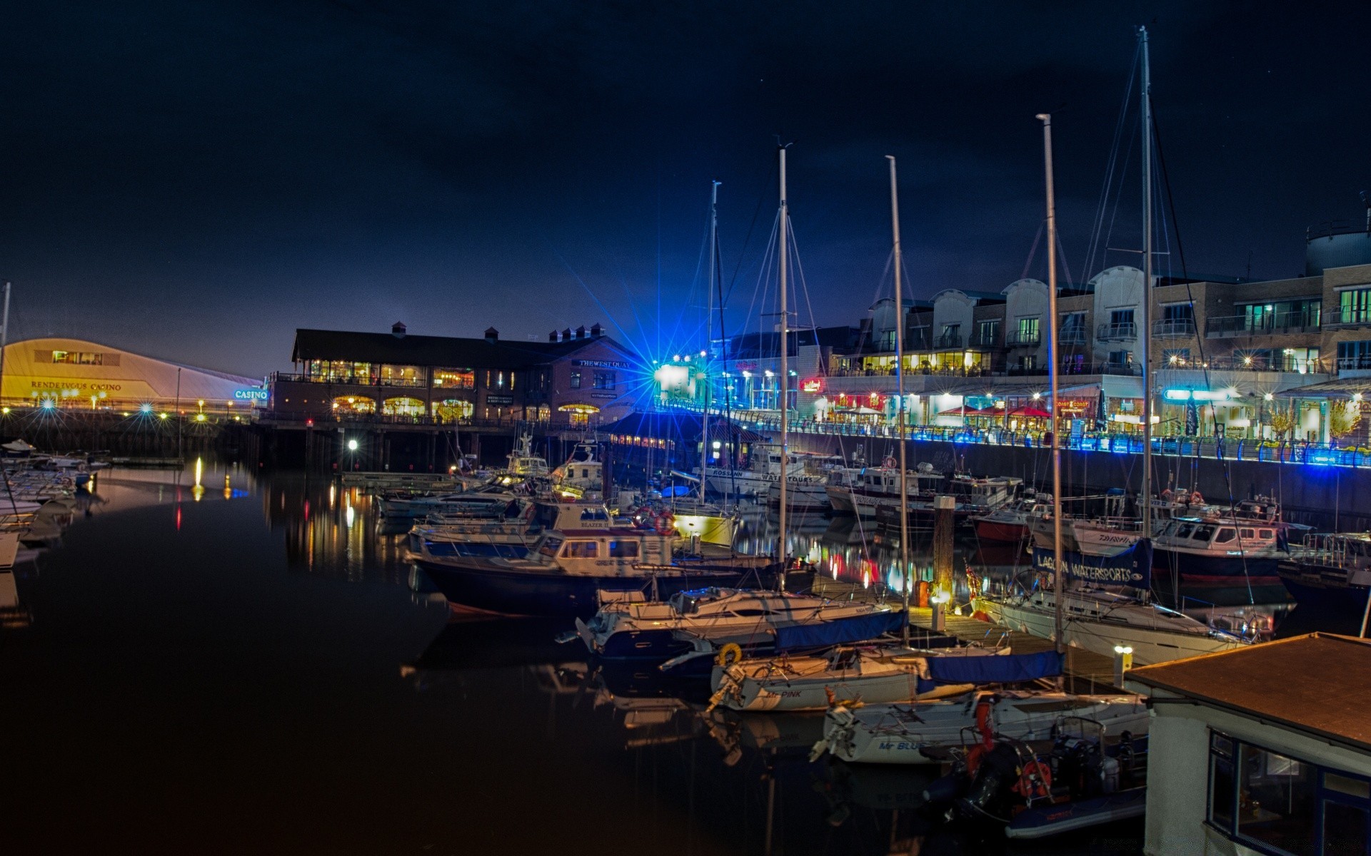 Café costero a la luz de linternas chinas y canoas en el muelle