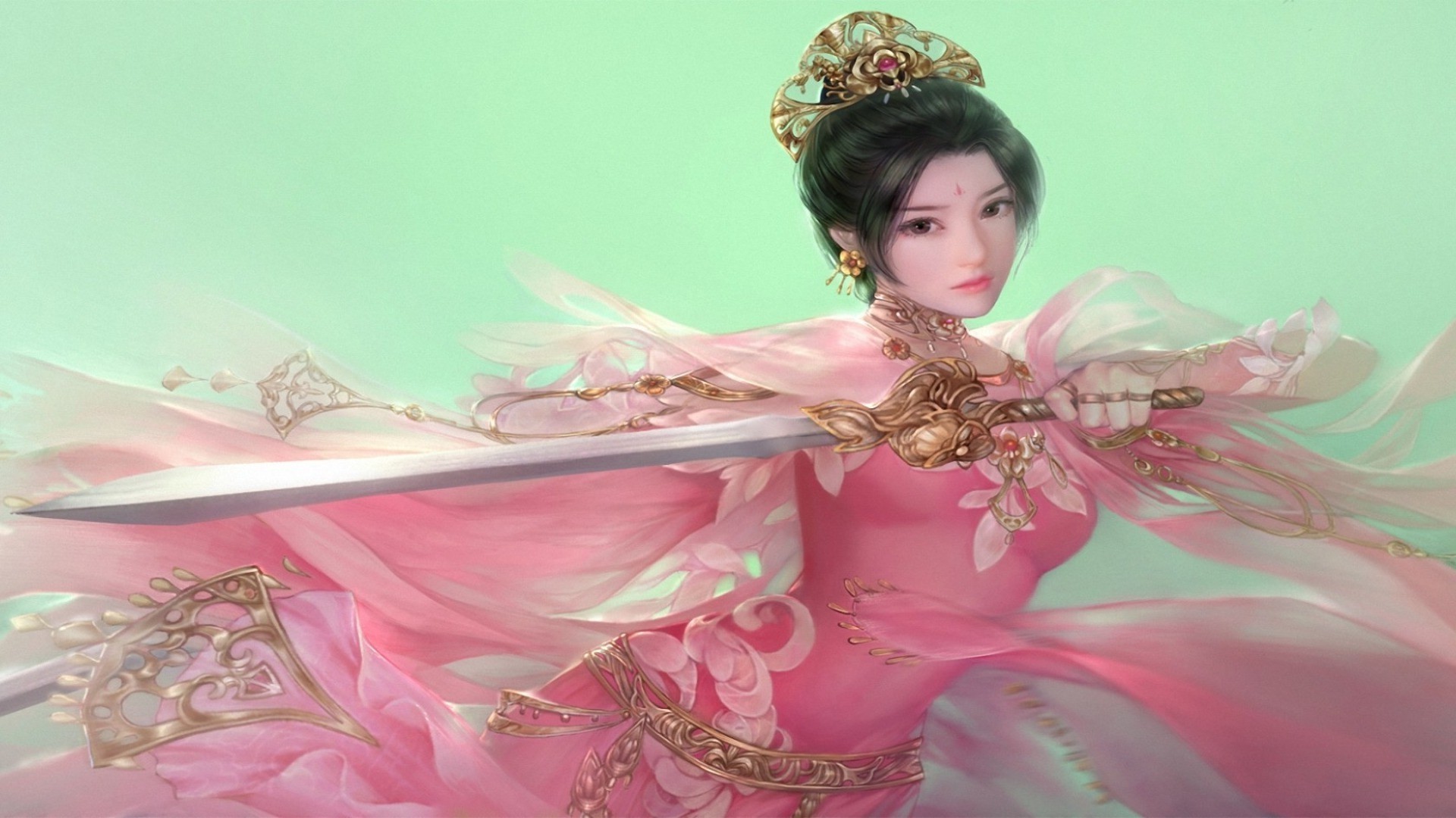 Delicada mujer en un vestido rosa con una espada