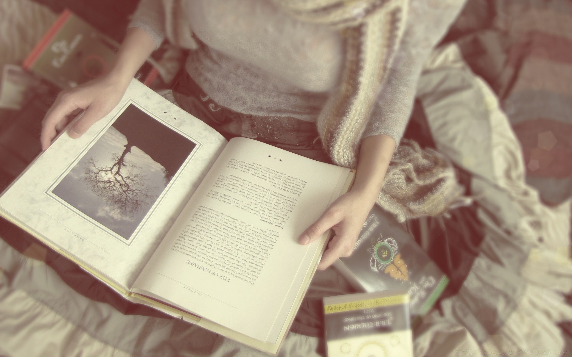 Mujer con libro abierto en el interior retro