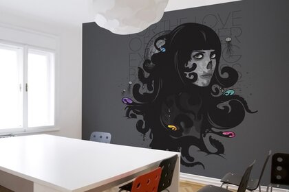 Imagen de una chica con el pelo negro en una pared interiorImagen de una chica con el pelo negro en una pared interior
