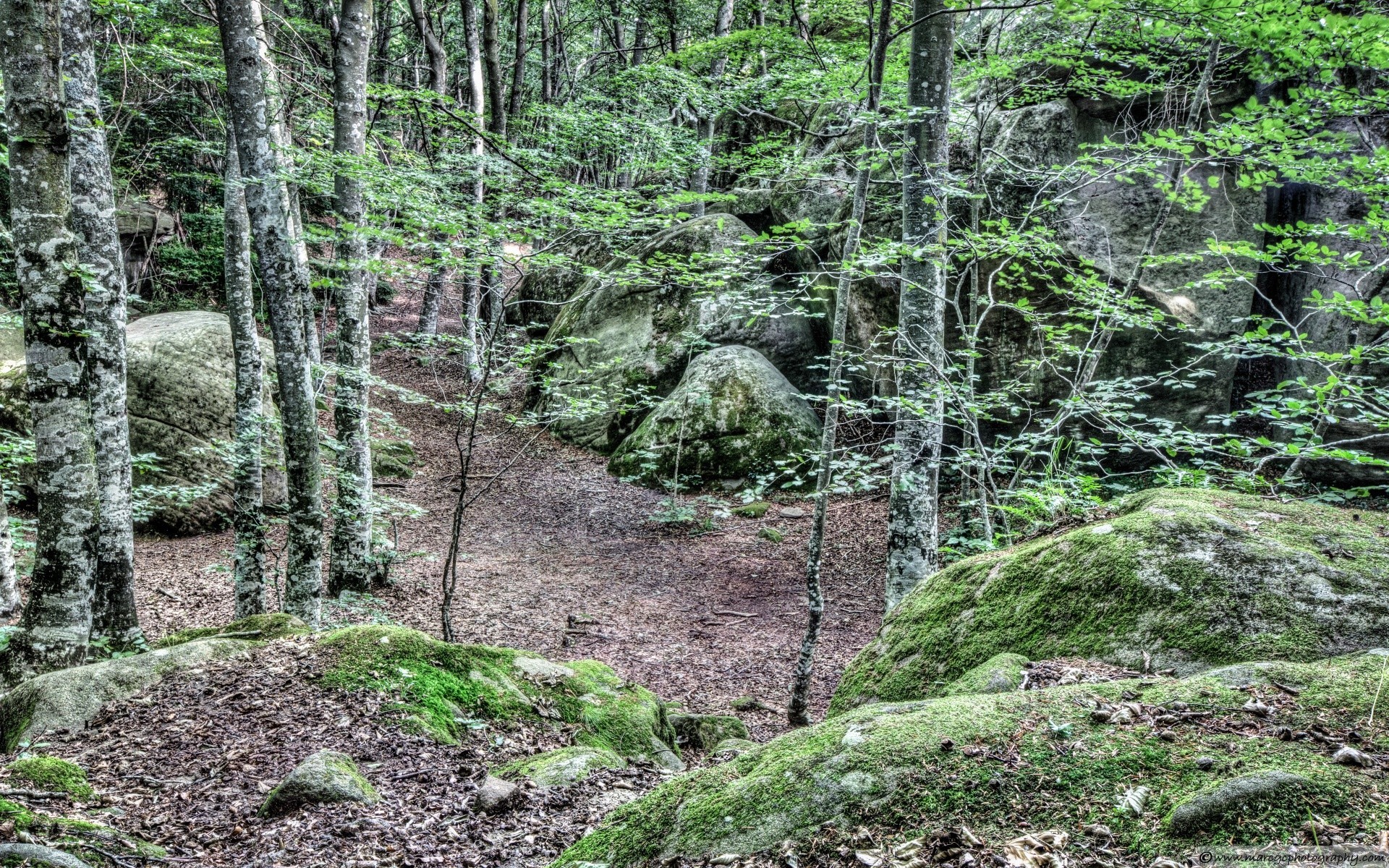 Árboles cubiertos de musgo en un bosque sombrío iluminado por el sol