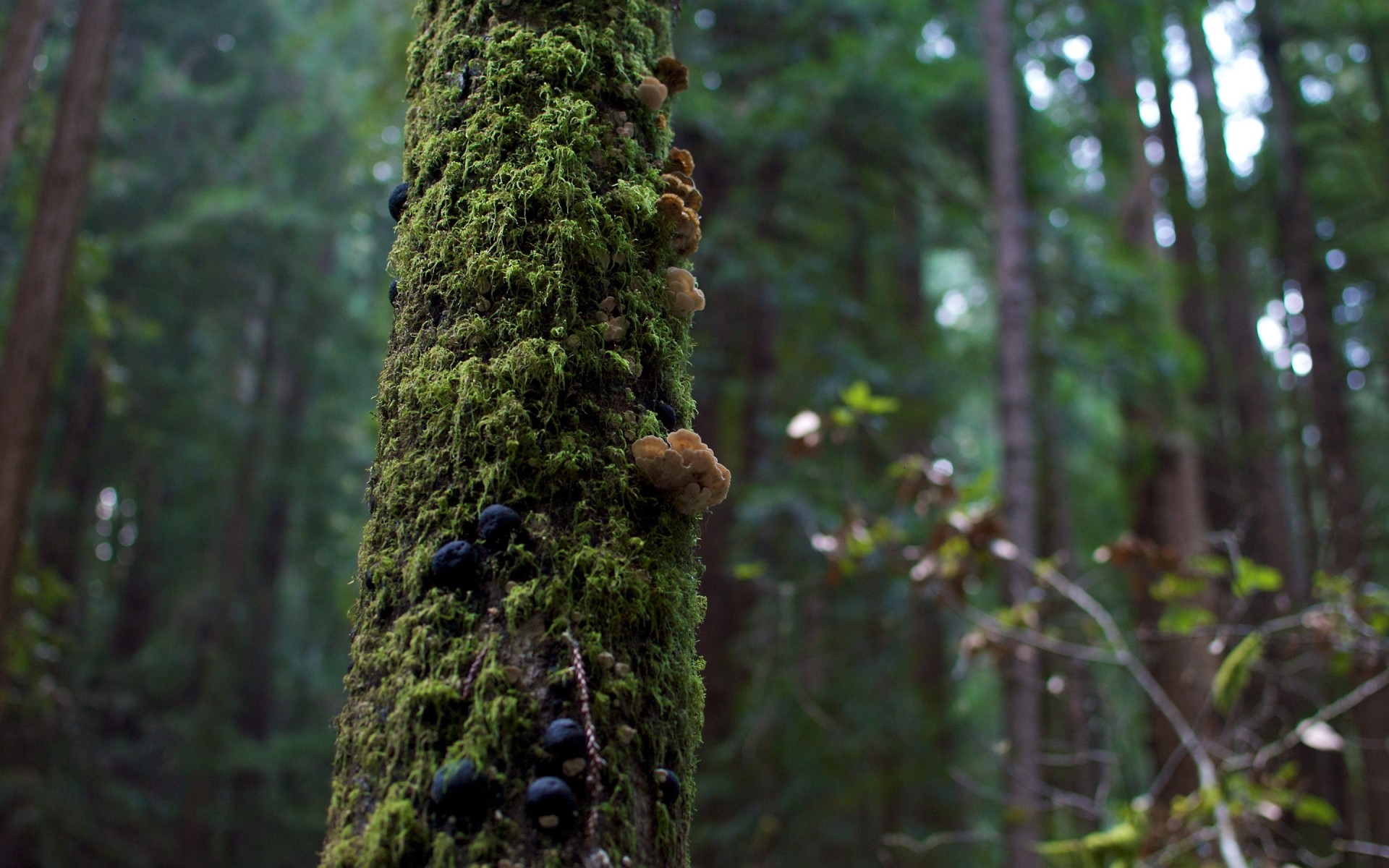 El musgo verde crece alto en los árboles