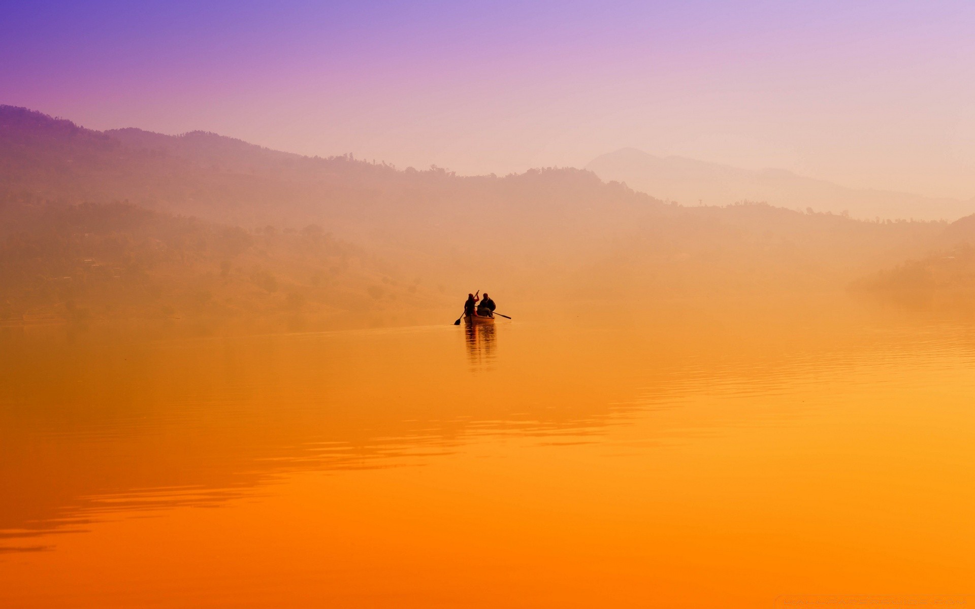 Barco con gente en la puesta de sol naranja