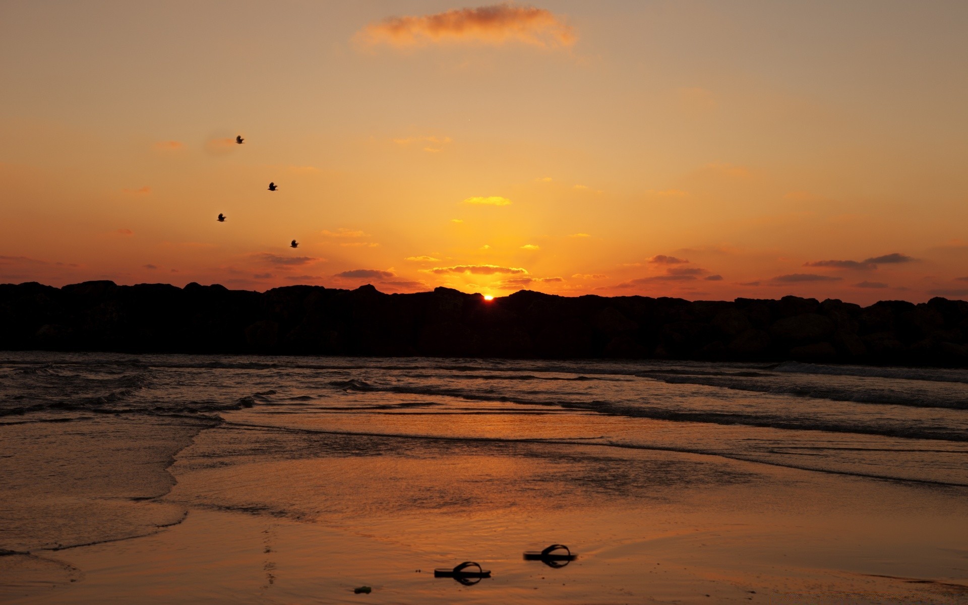 Puesta de sol naranja caliente sobre el mar de la tarde