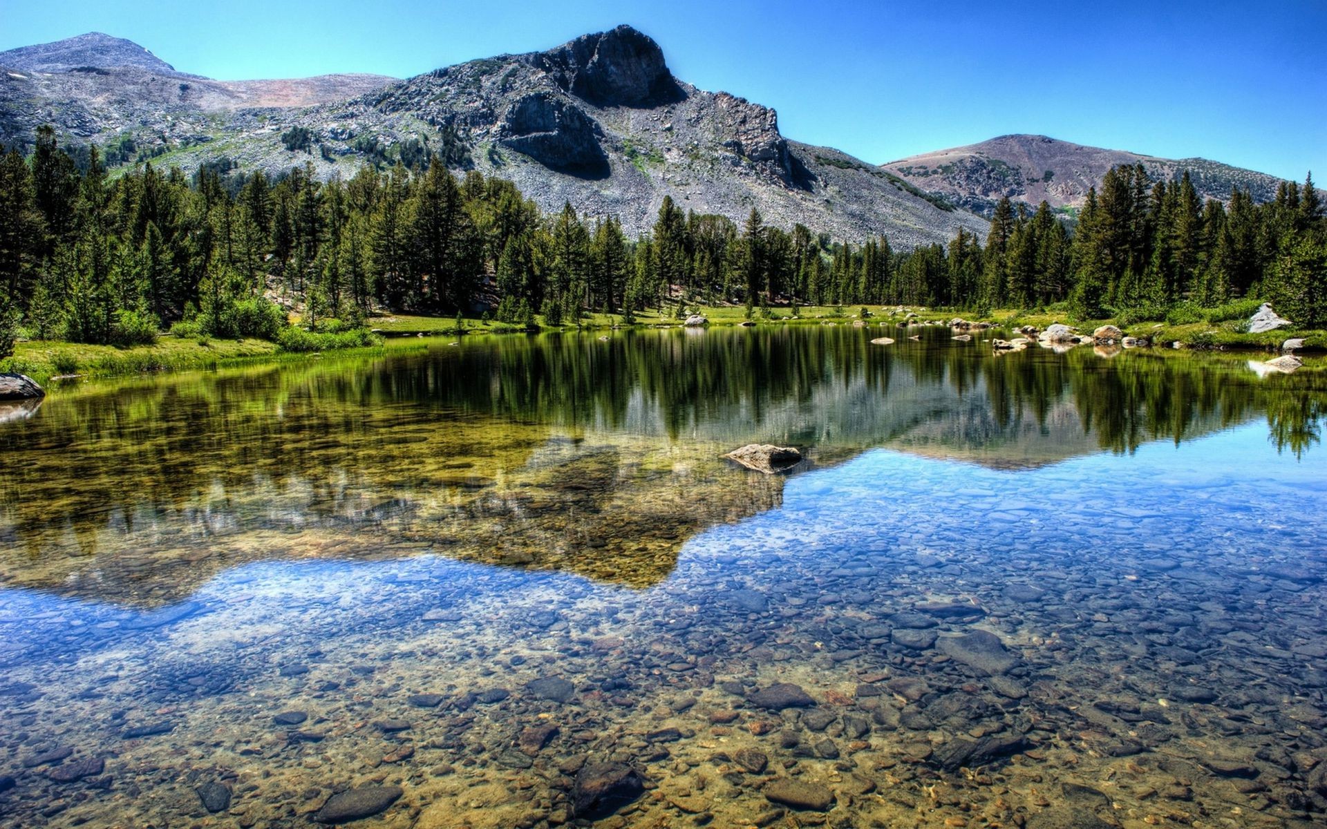 Paisaje del bosque en el fondo de un lago cristalino. Reflejo en el agua de los pinos del bosque