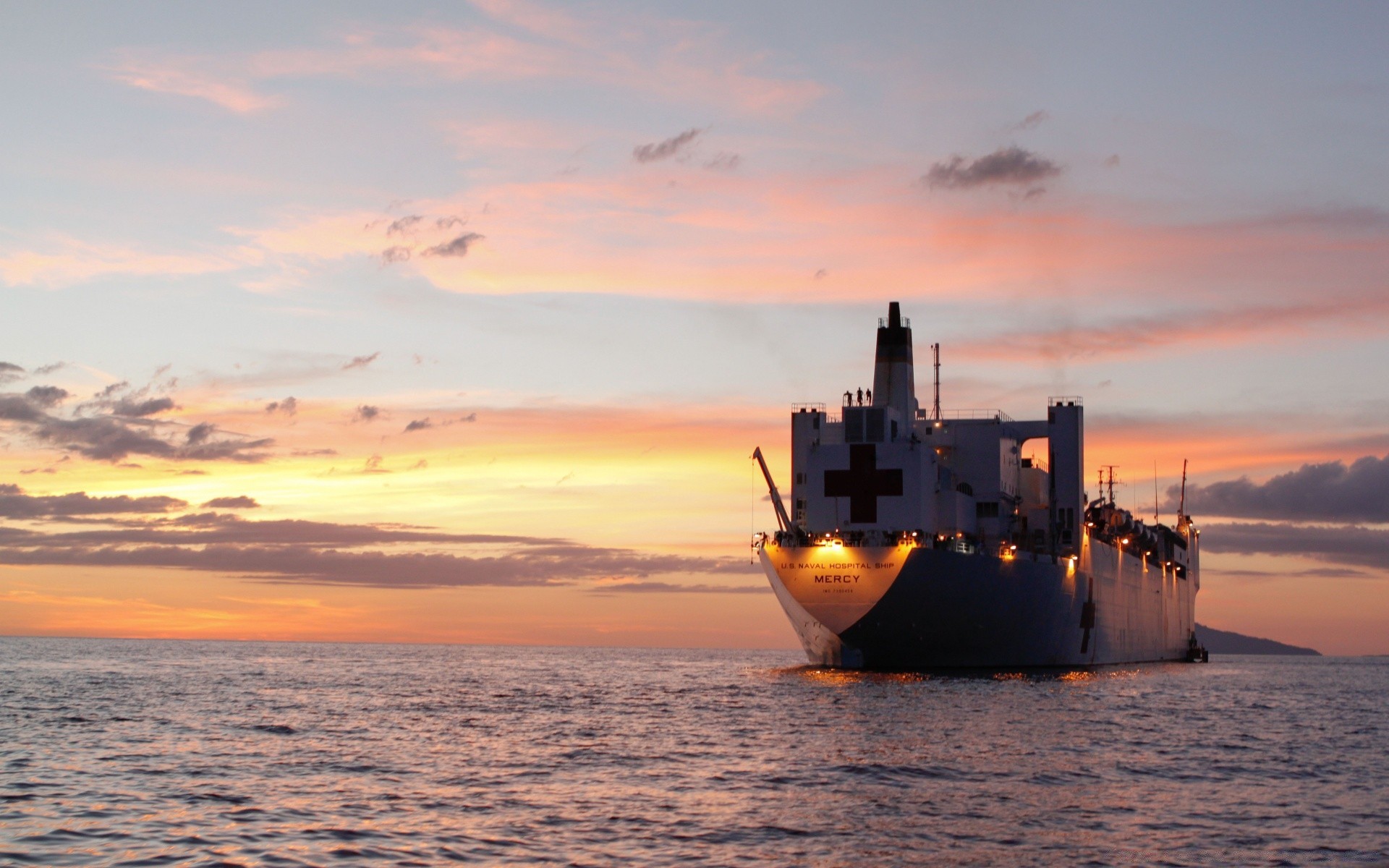 Arrastrero militar, puesta de sol en el mar