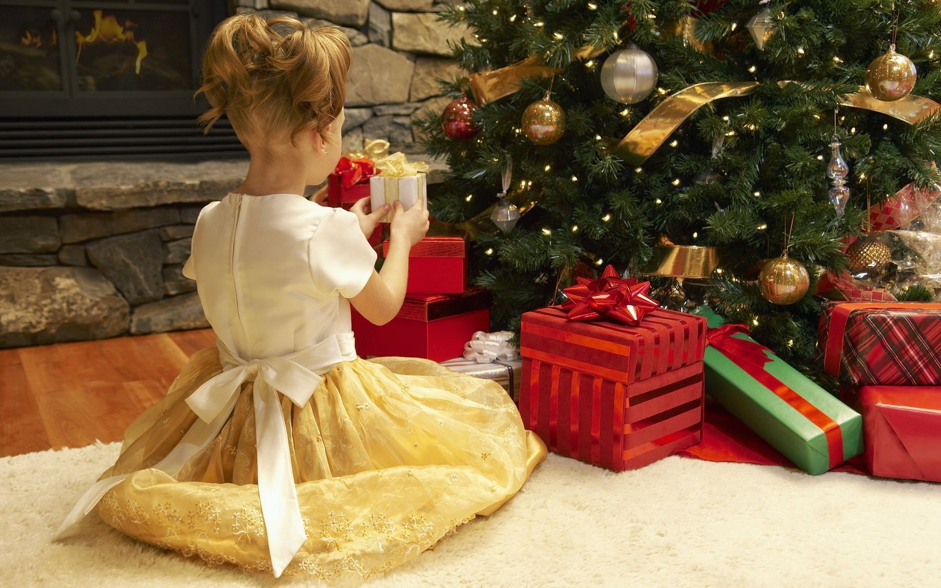Regalos bajo el árbol. niña abre regalos en navidadRegalos bajo el árbol. Niña abre regalos en Navidad