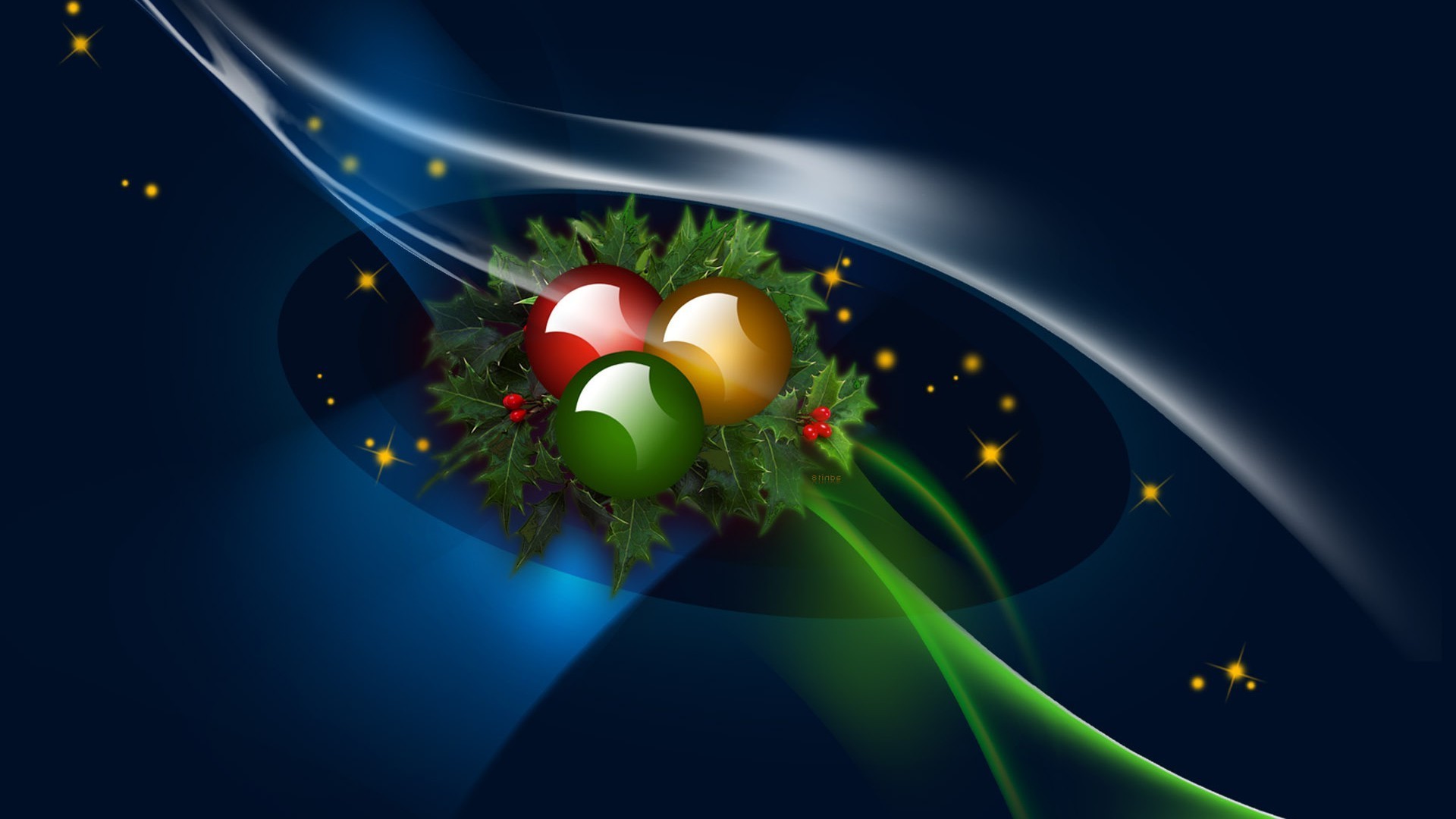 Bolas de Navidad multicolores en hojas verdes entre líneas multicolores