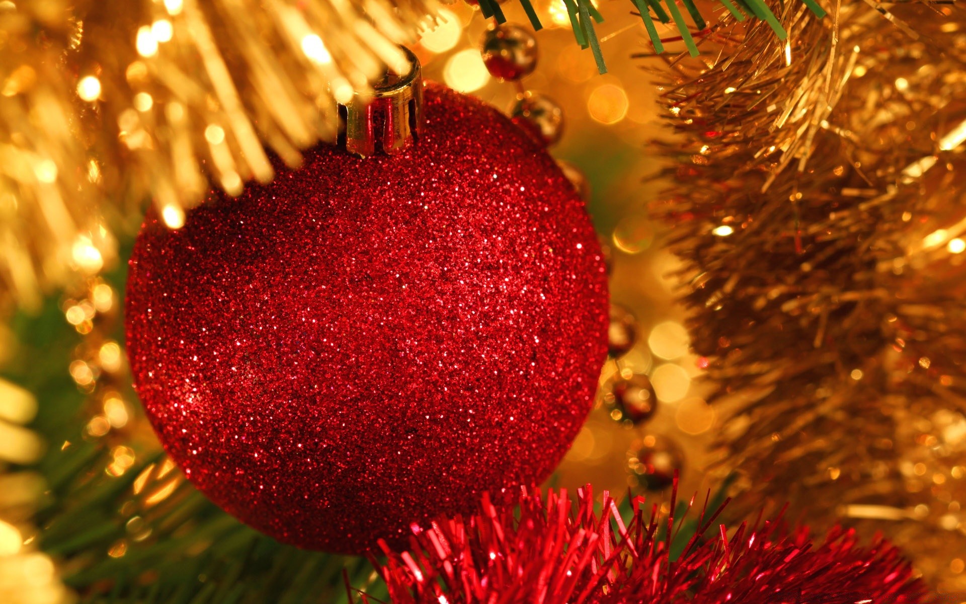 Tarjeta de Navidad bolas rojas sobre fondo dorado con linternas