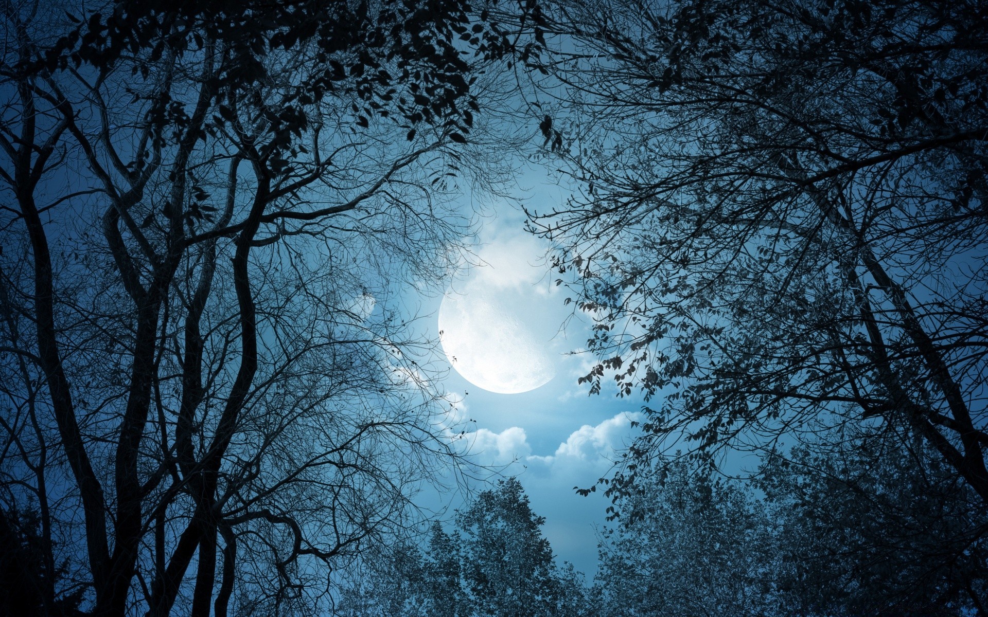 Paisaje nocturno con la Luna mirando a través de las nubes