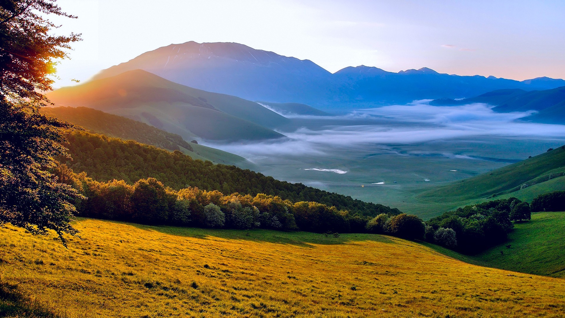 Amanecer. Niebla arrastrándose entre las verdes colinas