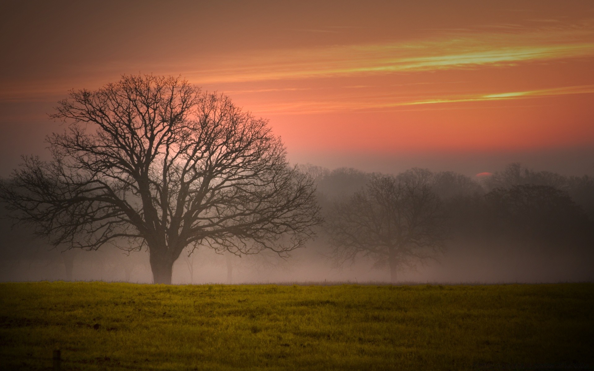 Hermosa instantánea del amanecer niebla temprano en la mañana