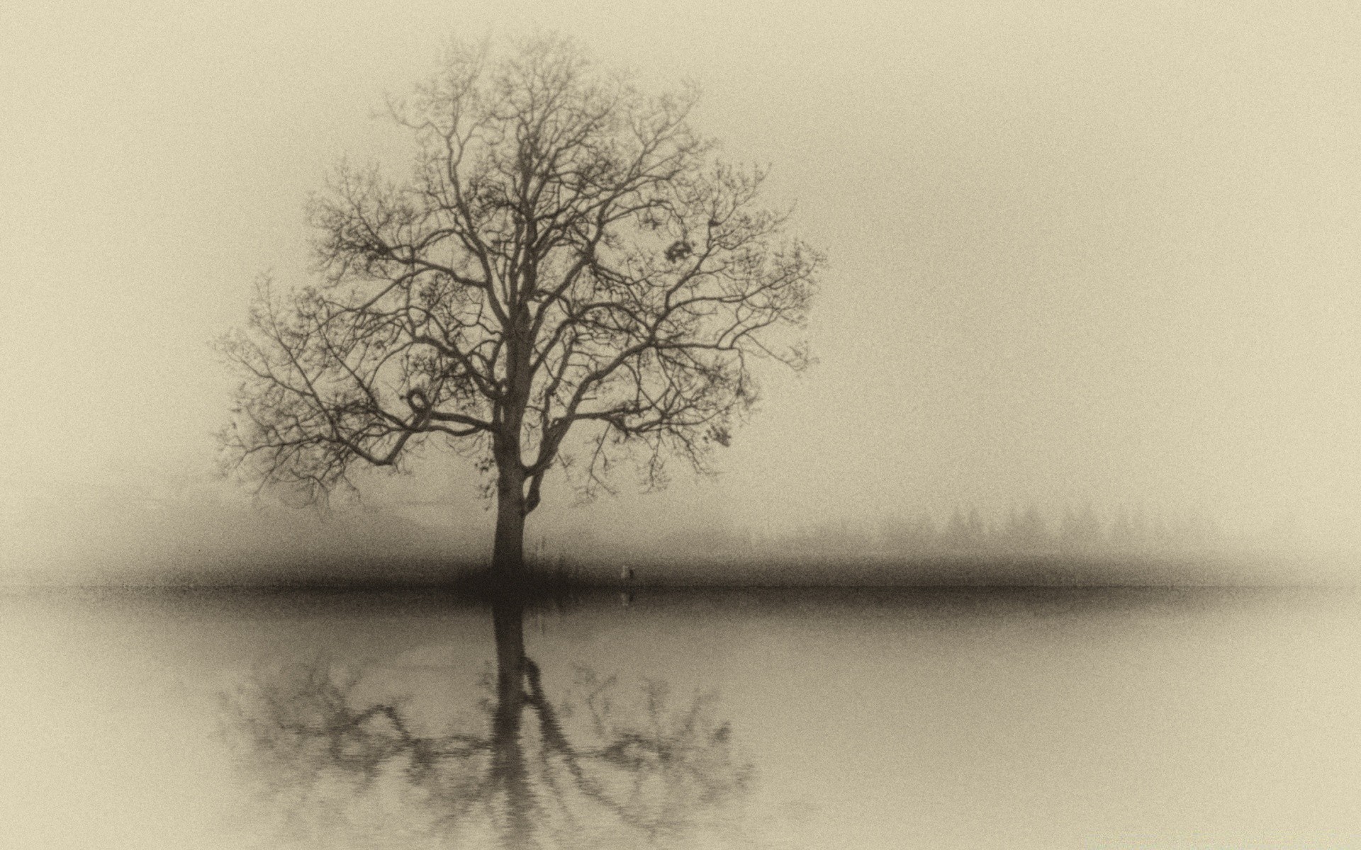 Un árbol solitario en la niebla, una versión clásica en blanco y negro