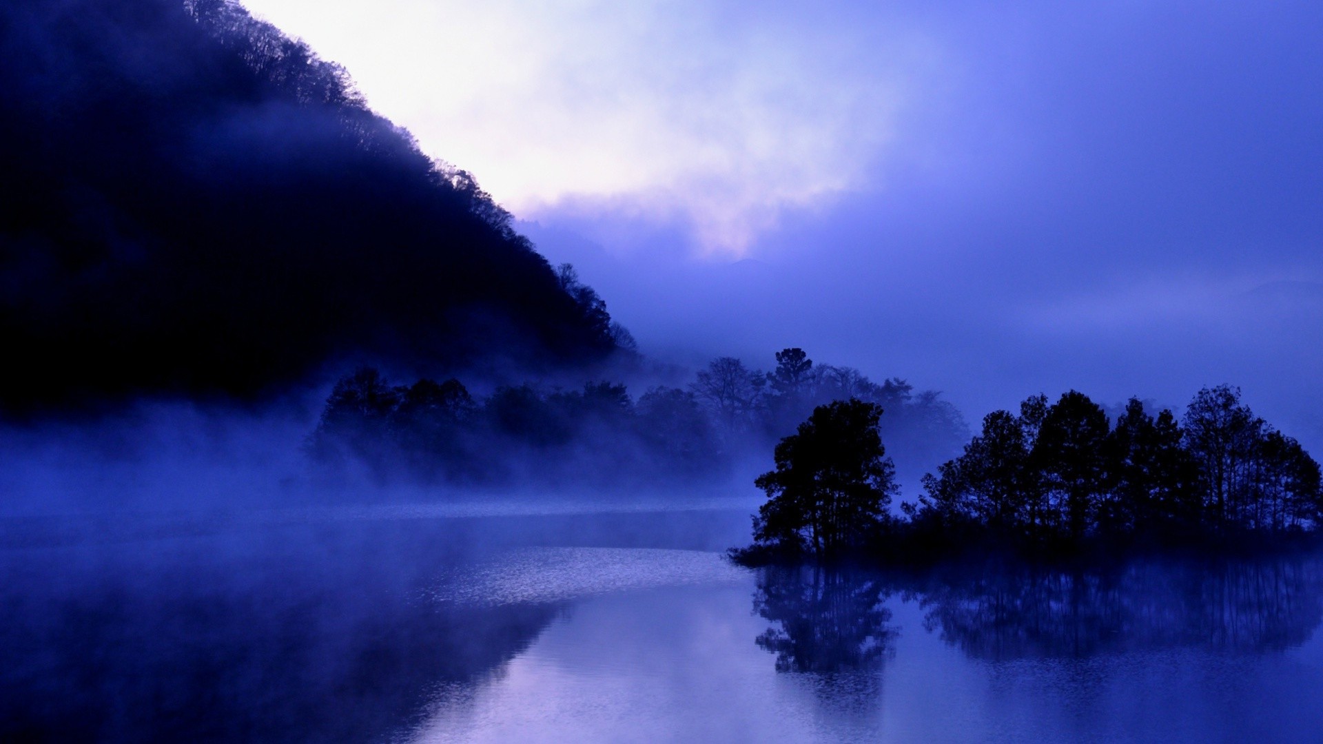 Niebla sobre un cuerpo de agua cerca de las montañas en tonos azules