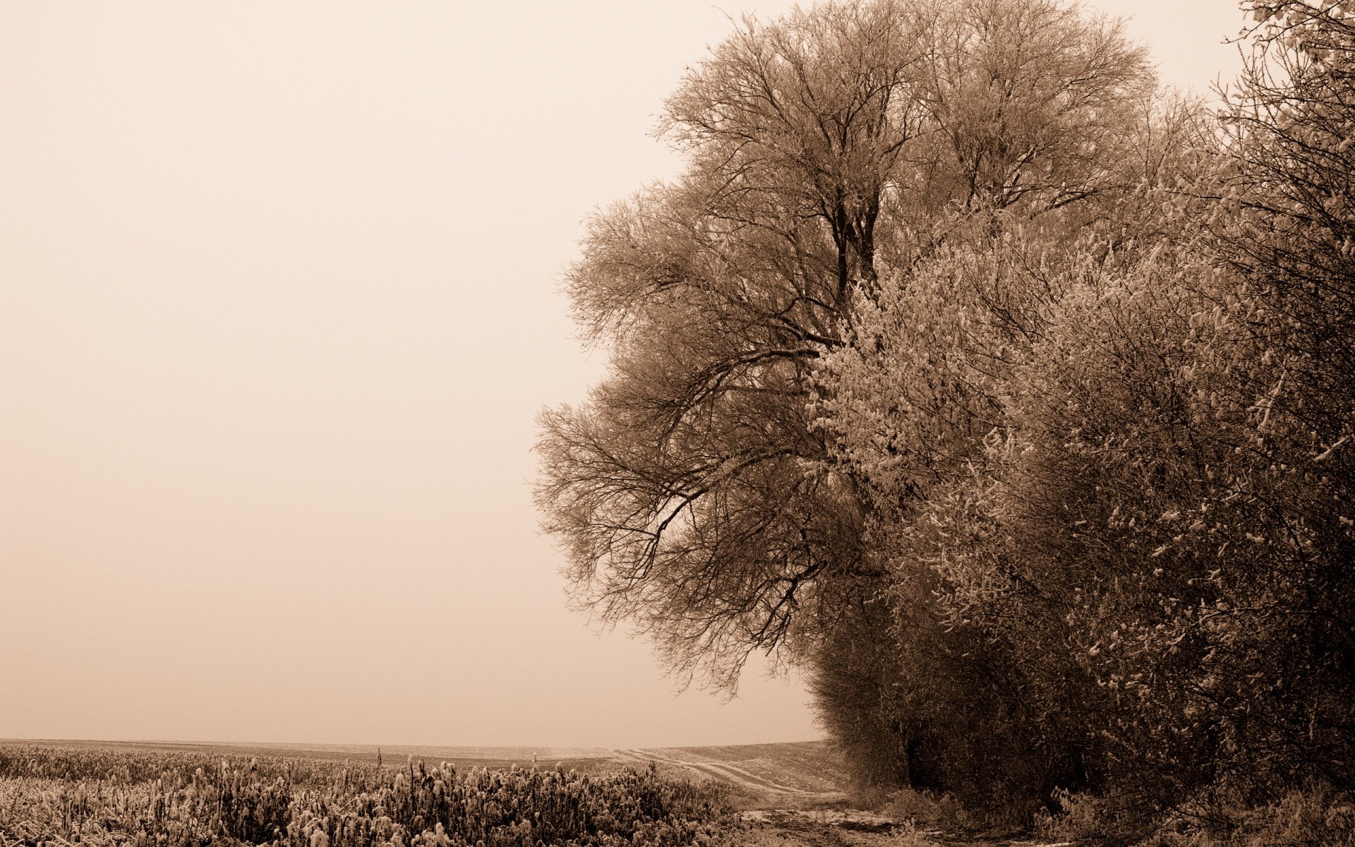 Un paisaje brumoso y misterioso con campos y un sol suave
