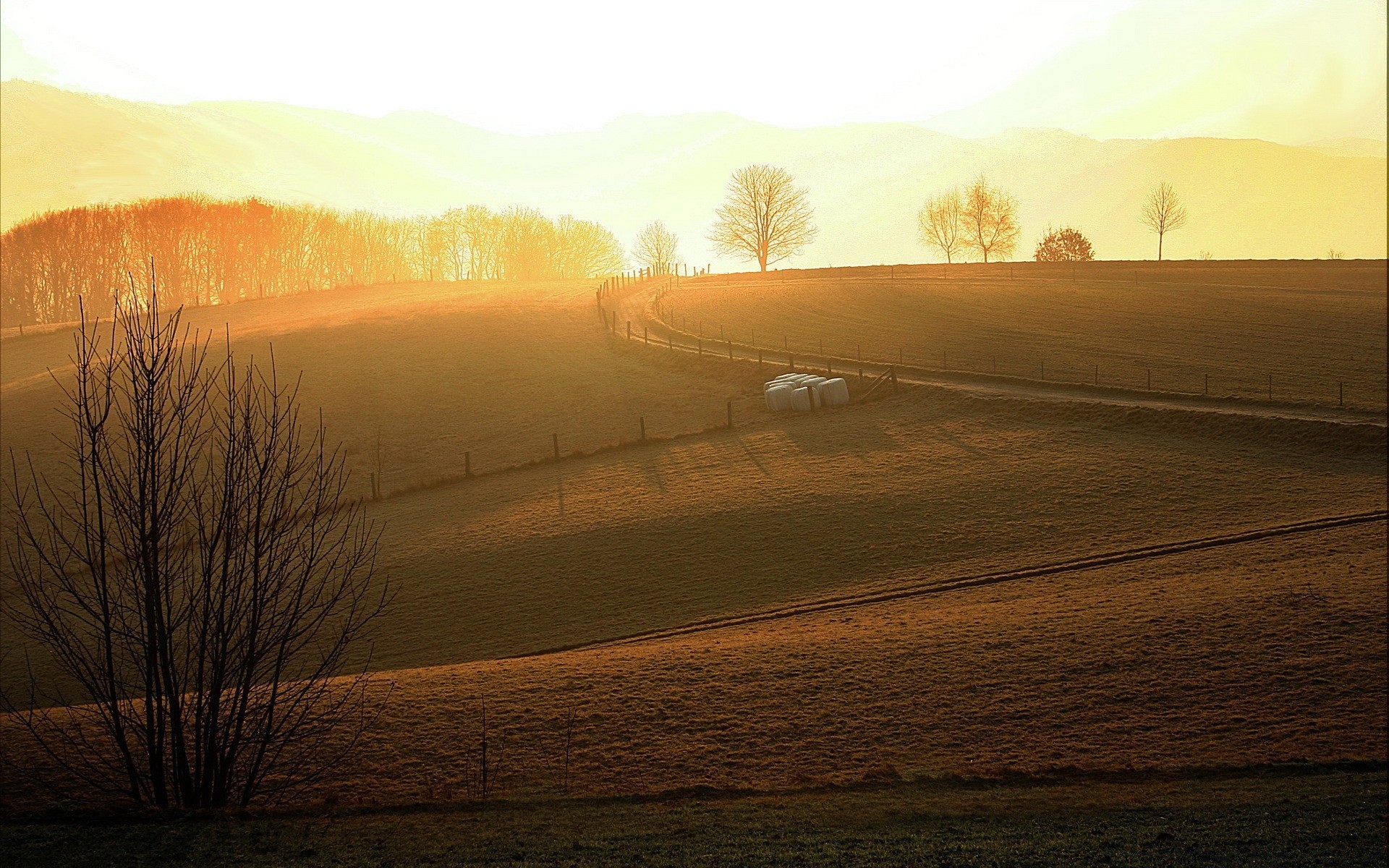 Foto de las montañas en la niebla en el fondo de la puesta de sol