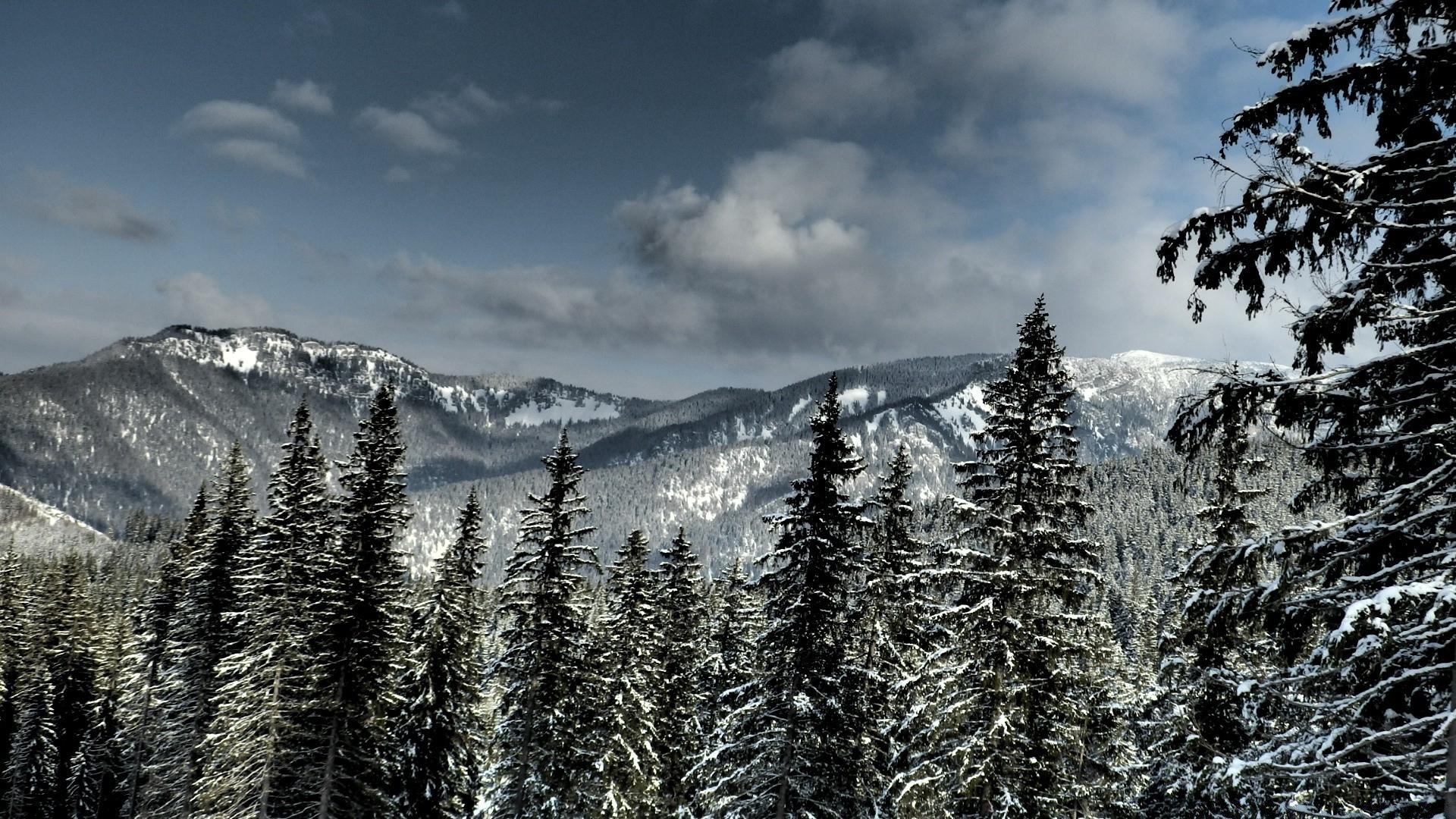 Abetos centenarios cubiertos de nieve en el fondo de las montañas