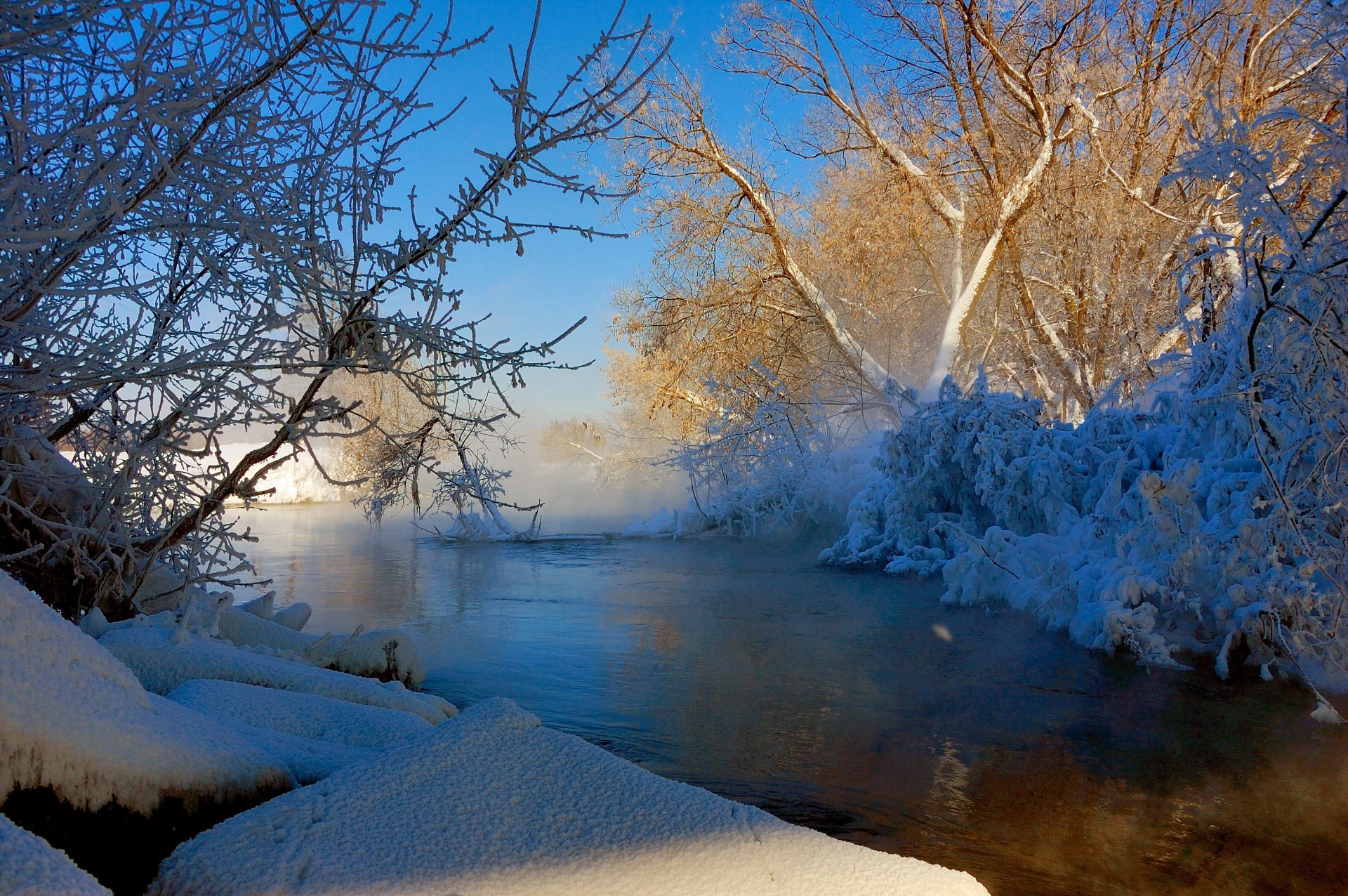 Paisaje invernal, nieve y río