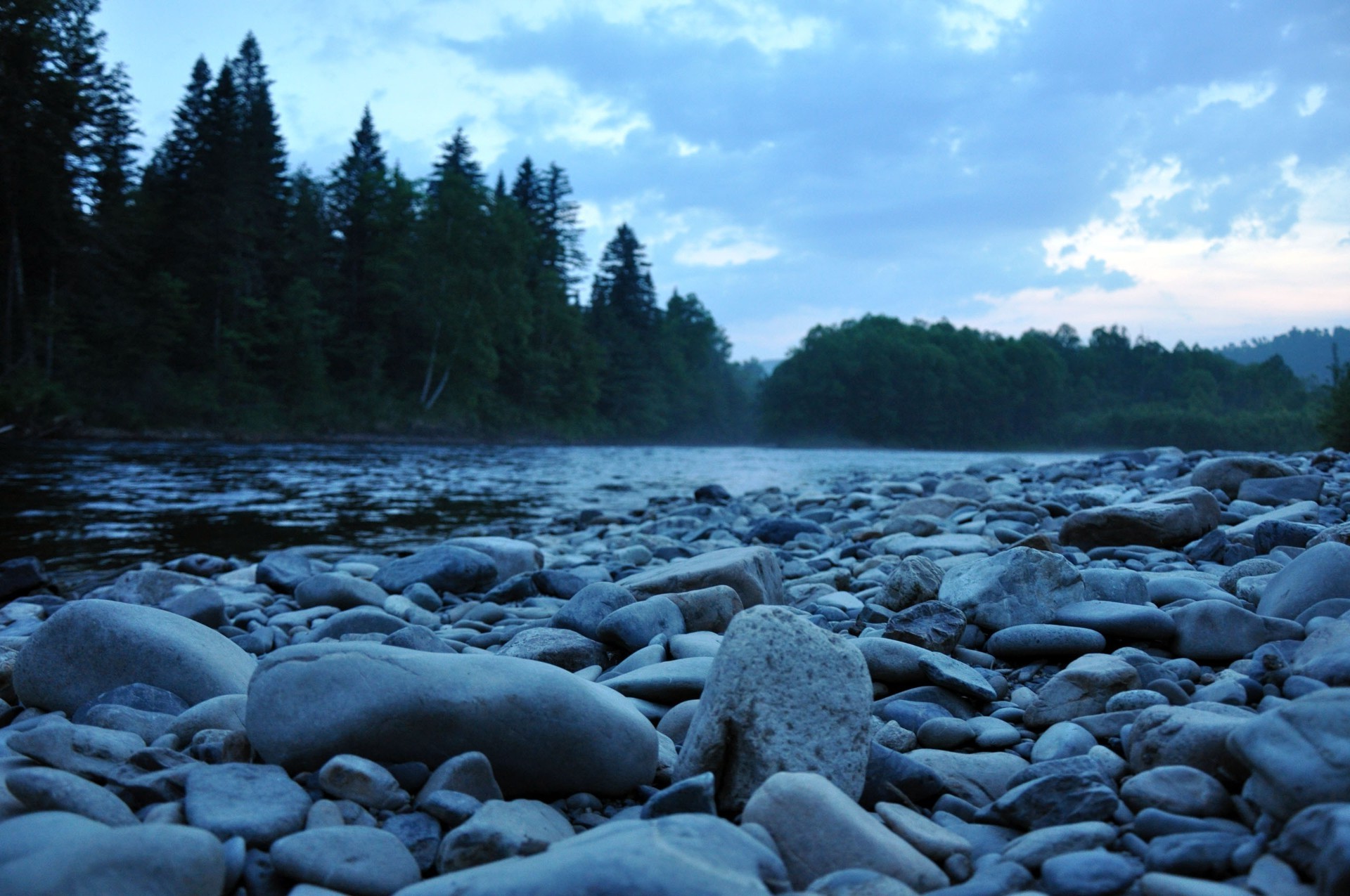 Vista del lago nocturno con guijarros