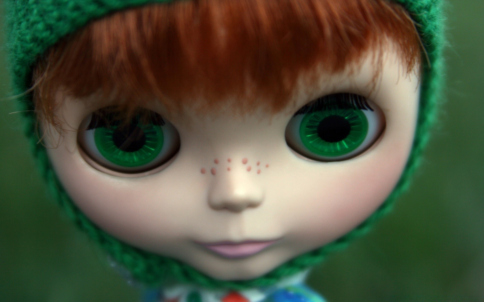 Muñeca en un gorro verde de punto con enormes ojos verdes