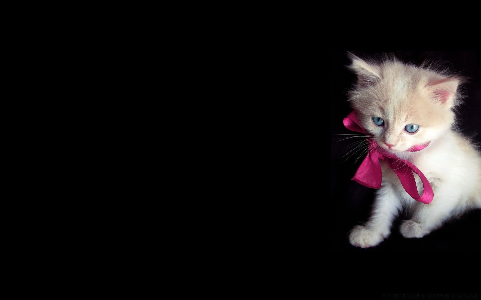 Gatito con ojos azules y lazo rosa sobre fondo negro