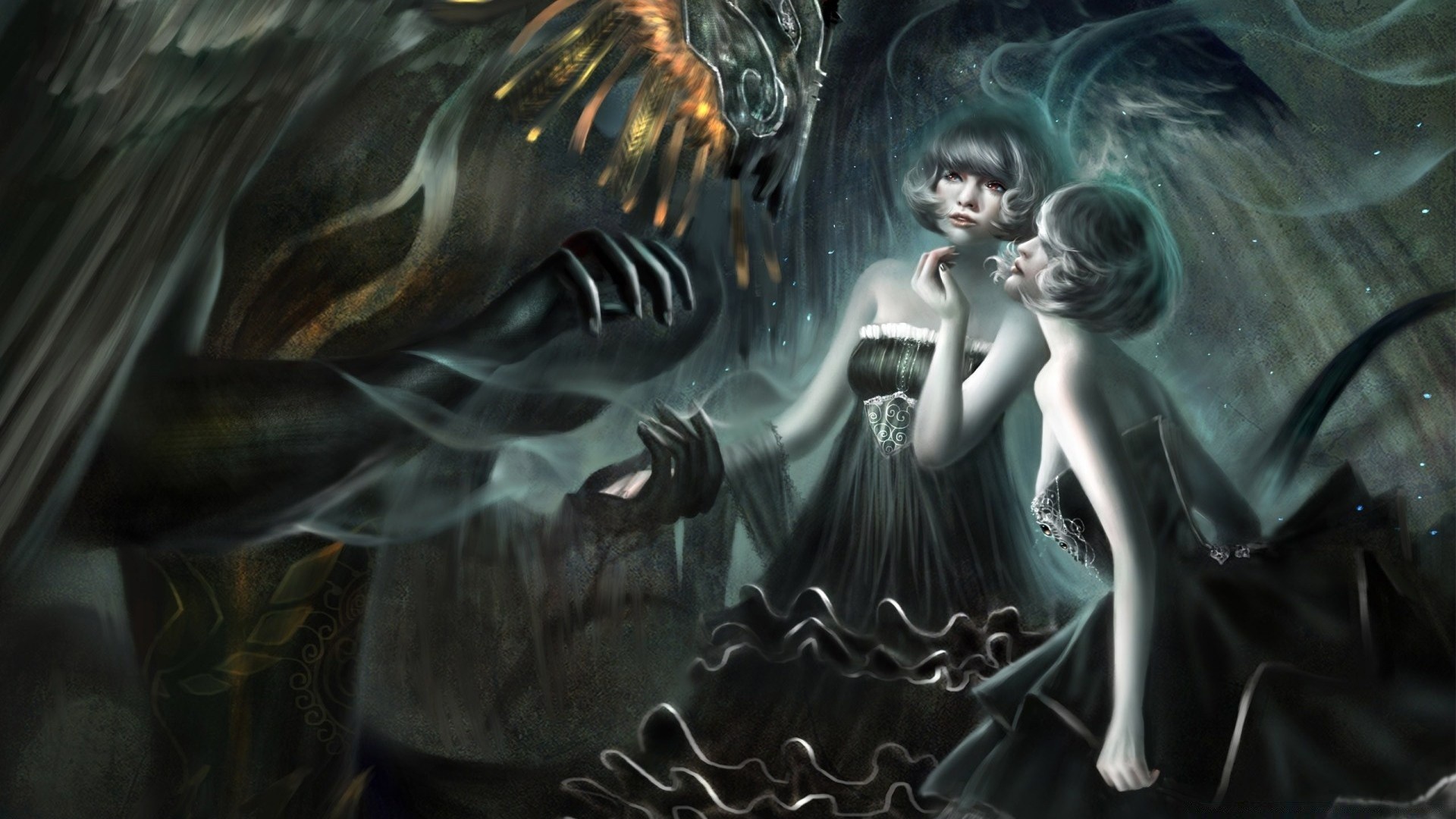 Dos chicas en la oscuridad junto al monstruo