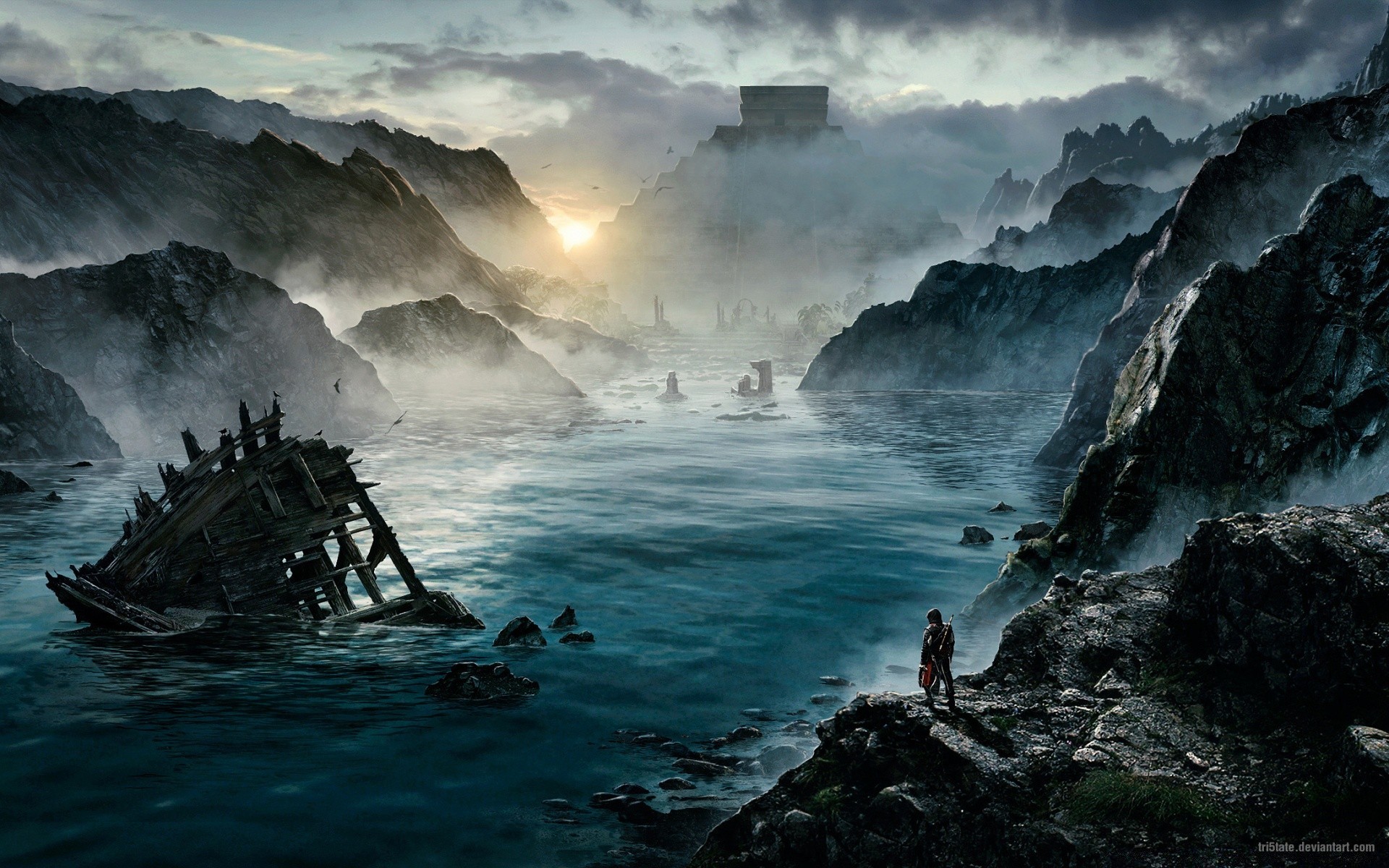 Paisaje de montaña con río y palacios