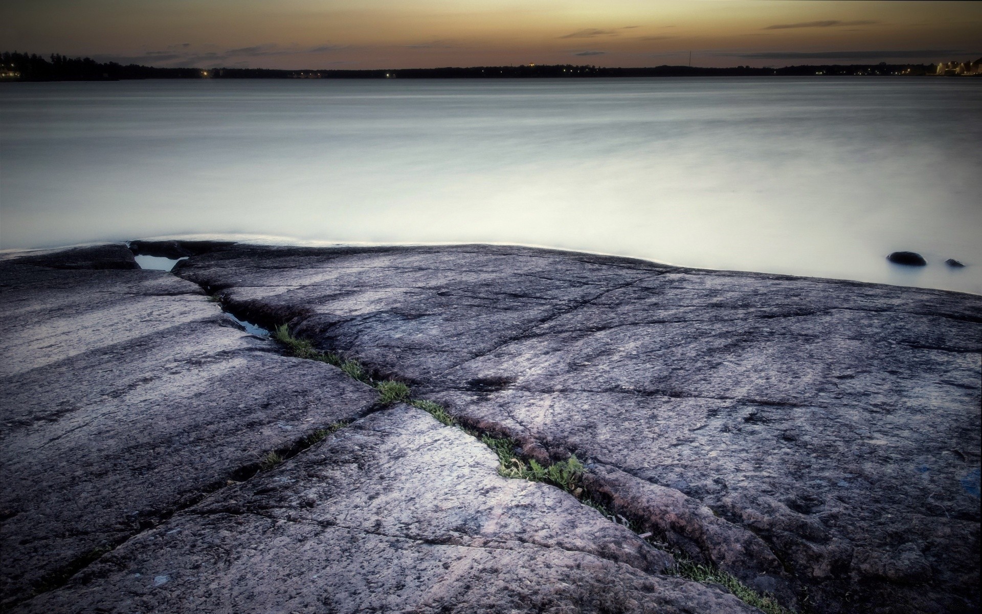 Paisaje al atardecer, ciudad en el horizonte