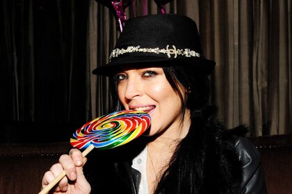 La chica del sombrero. Caramelo en un palo. Chica con caramelo