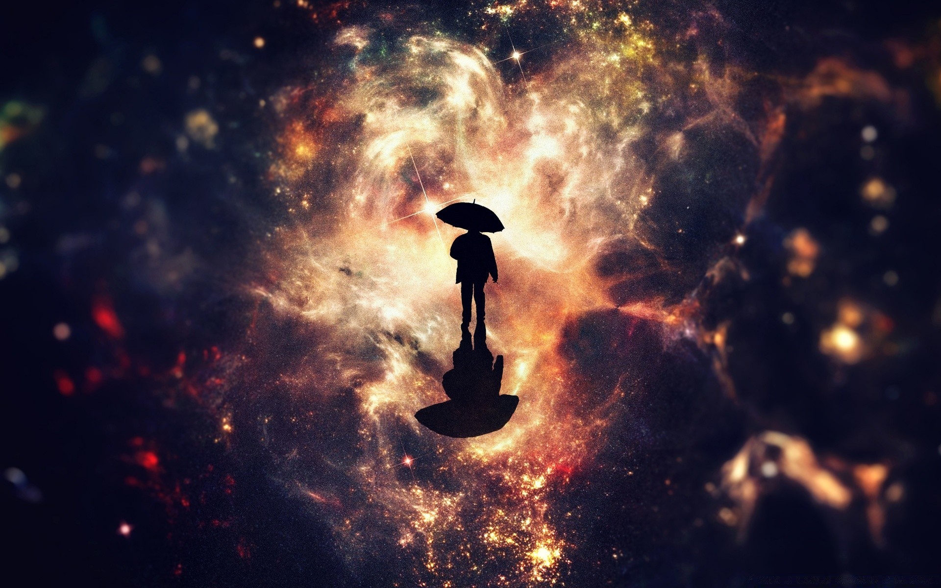 Niña sentada bajo un paraguas cerca del ferrocarril