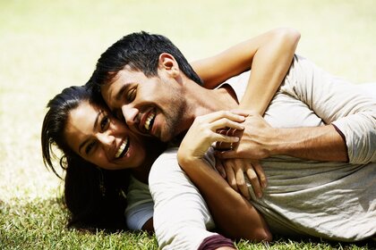 Pareja de jóvenes enamorados en medio de la puesta de solPareja de jóvenes enamorados en medio de la puesta de sol