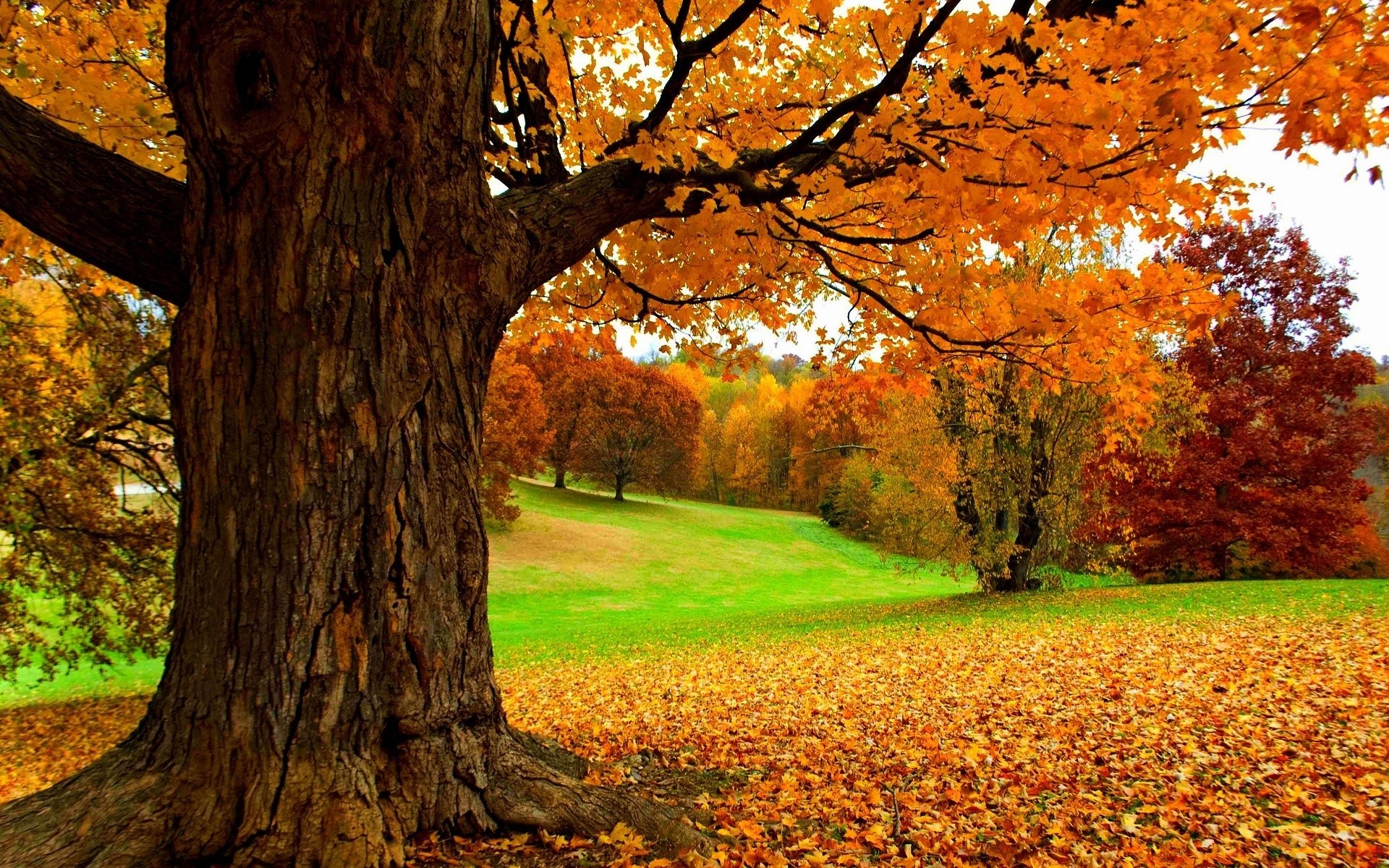 Parque de otoño con hojas caídas de color amarillo y rojo
