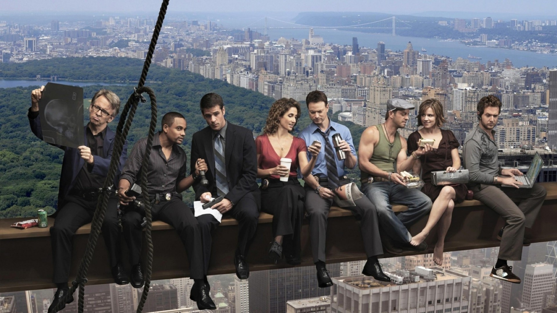 Personas de diferentes profesiones se sientan en una viga a la altura de un rascacielos