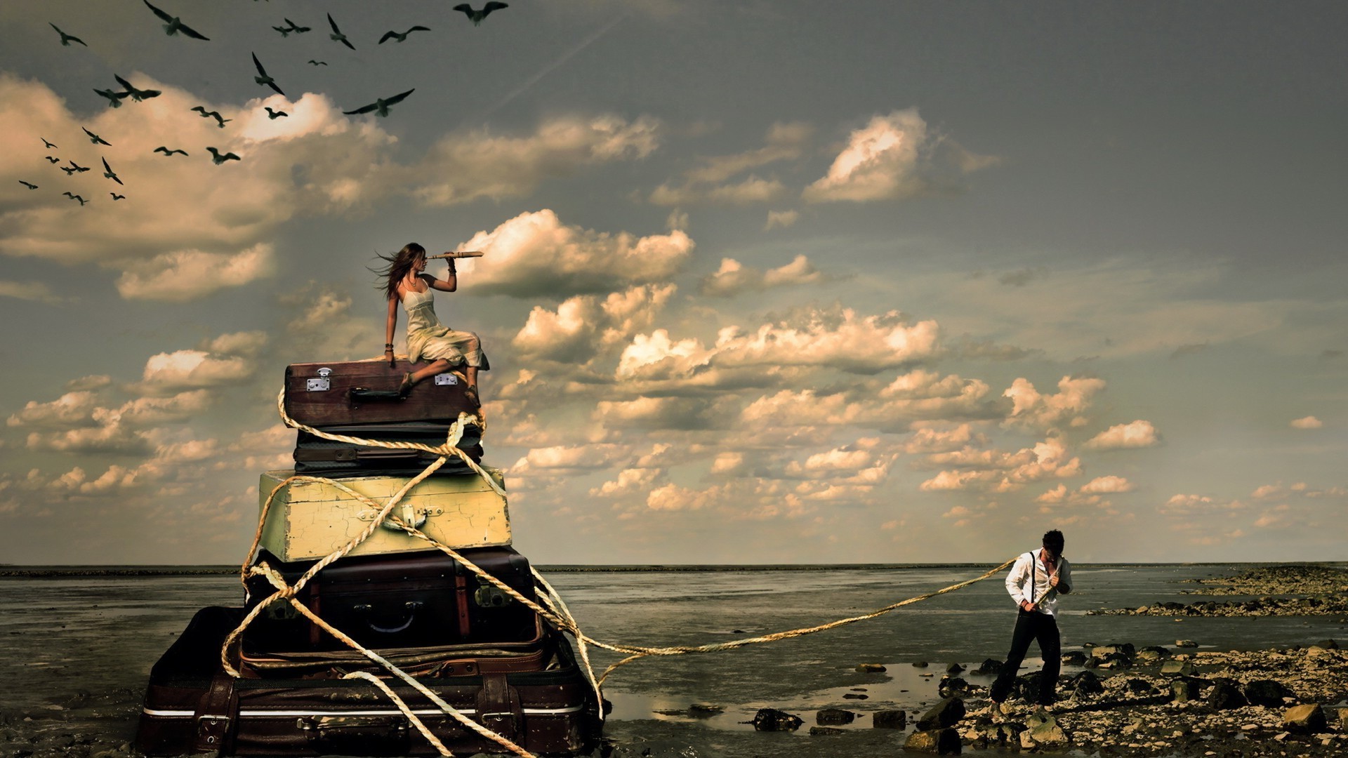 Hombre tirando de las maletas de una hermosa chica en la playa como Burlak