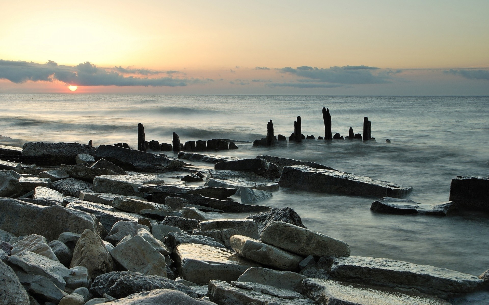 Playa de arena junto al océano con bloques de piedra
