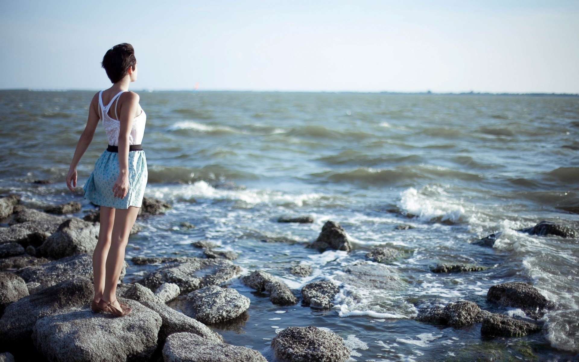 Una niña yace con un vestido rojo en una piedra junto a una cascadaUna niña yace con un vestido rojo en una piedra junto a una cascada