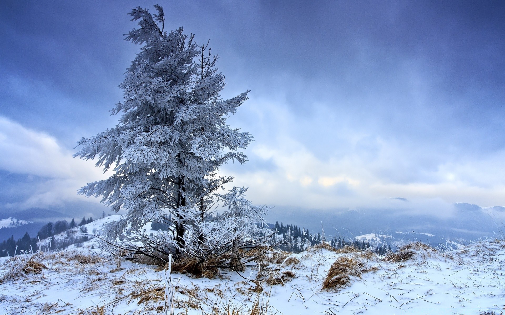 Abeto solitario congelado nevado