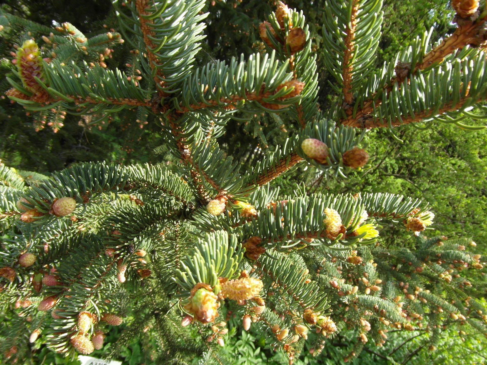 Una rama de abeto verde con juguetes colgados sobre un fondo azul