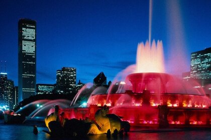 Luces de la fuente de la ciudad entre los rascacielosLuces de la fuente de la ciudad entre los rascacielos