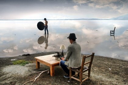Un hombre se mete en la mesa junto al mar