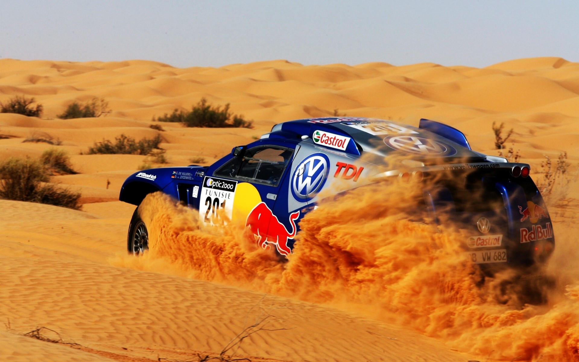 Carrera en el desierto en un automóvil de pasajeros por la tarde