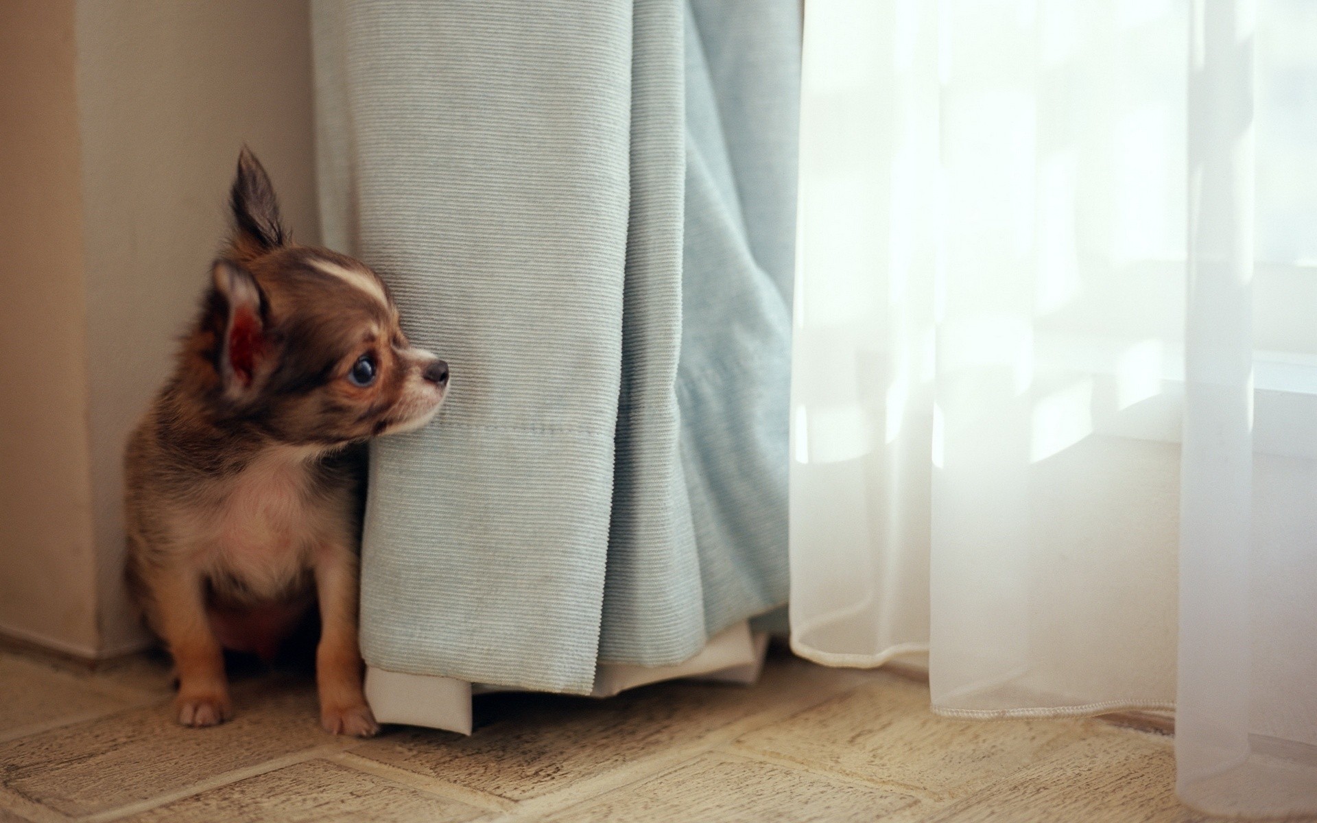 El enano pintcher asombra por detrás de las cortinas en las calles