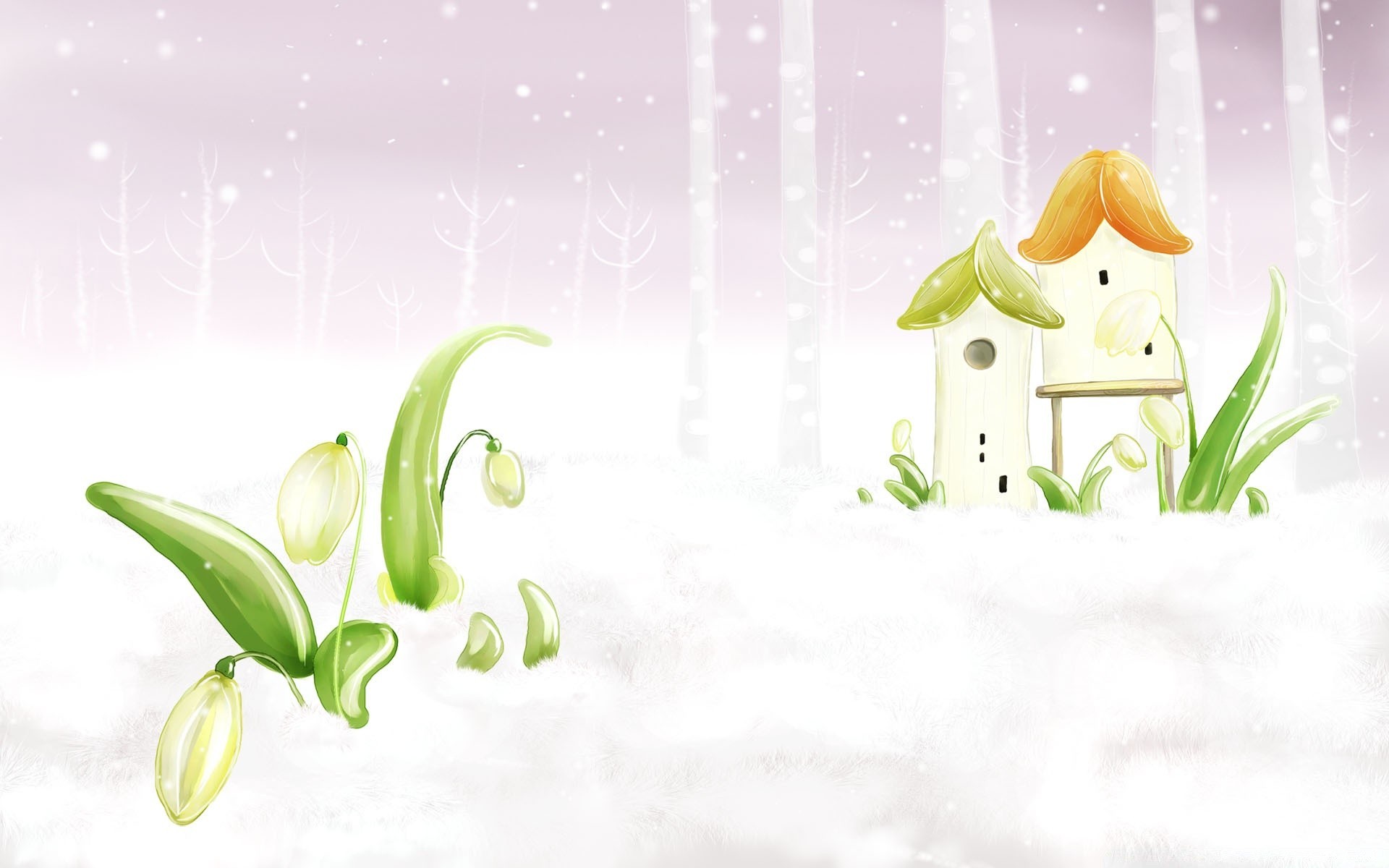 Dibujo de campanillas de nieve y casas de cuento de hadas