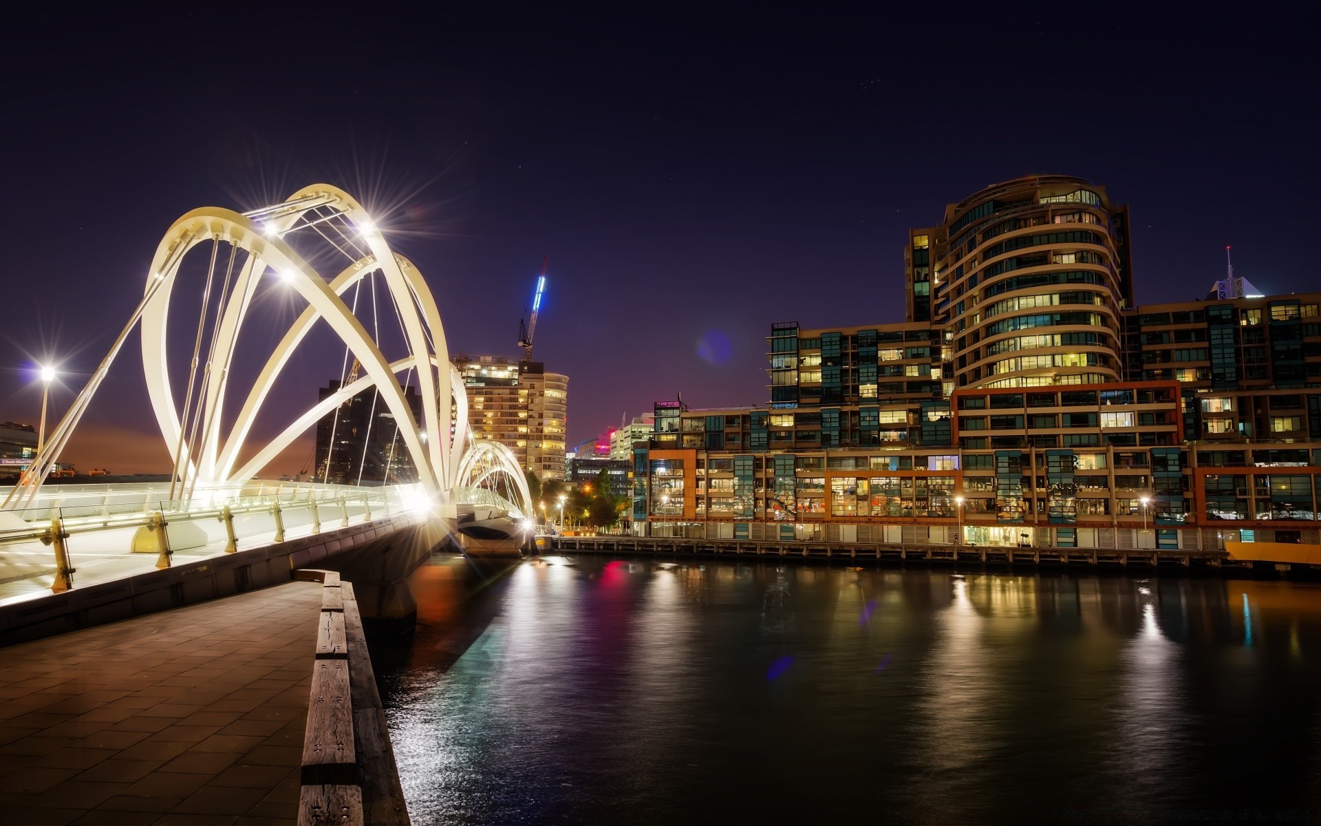Puente en América, cortando las aguas en el fondo de la puesta de sol