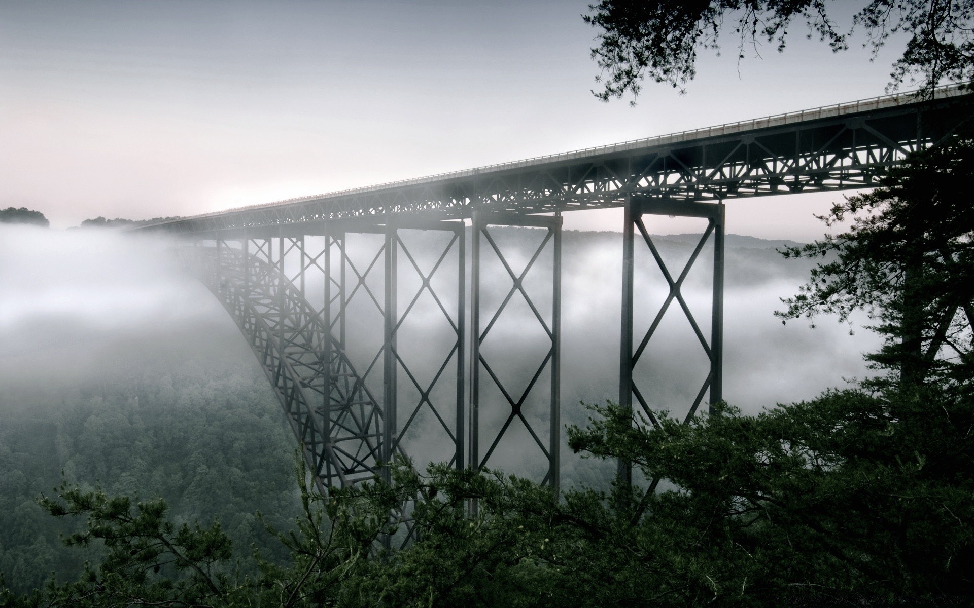 Puente que sale en una espesa niebla