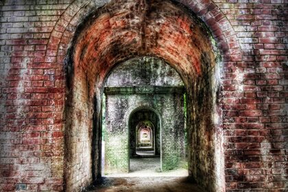 Arco abovedado de una antigua casa de ladrillo rojoArco abovedado de una antigua casa de ladrillo rojo