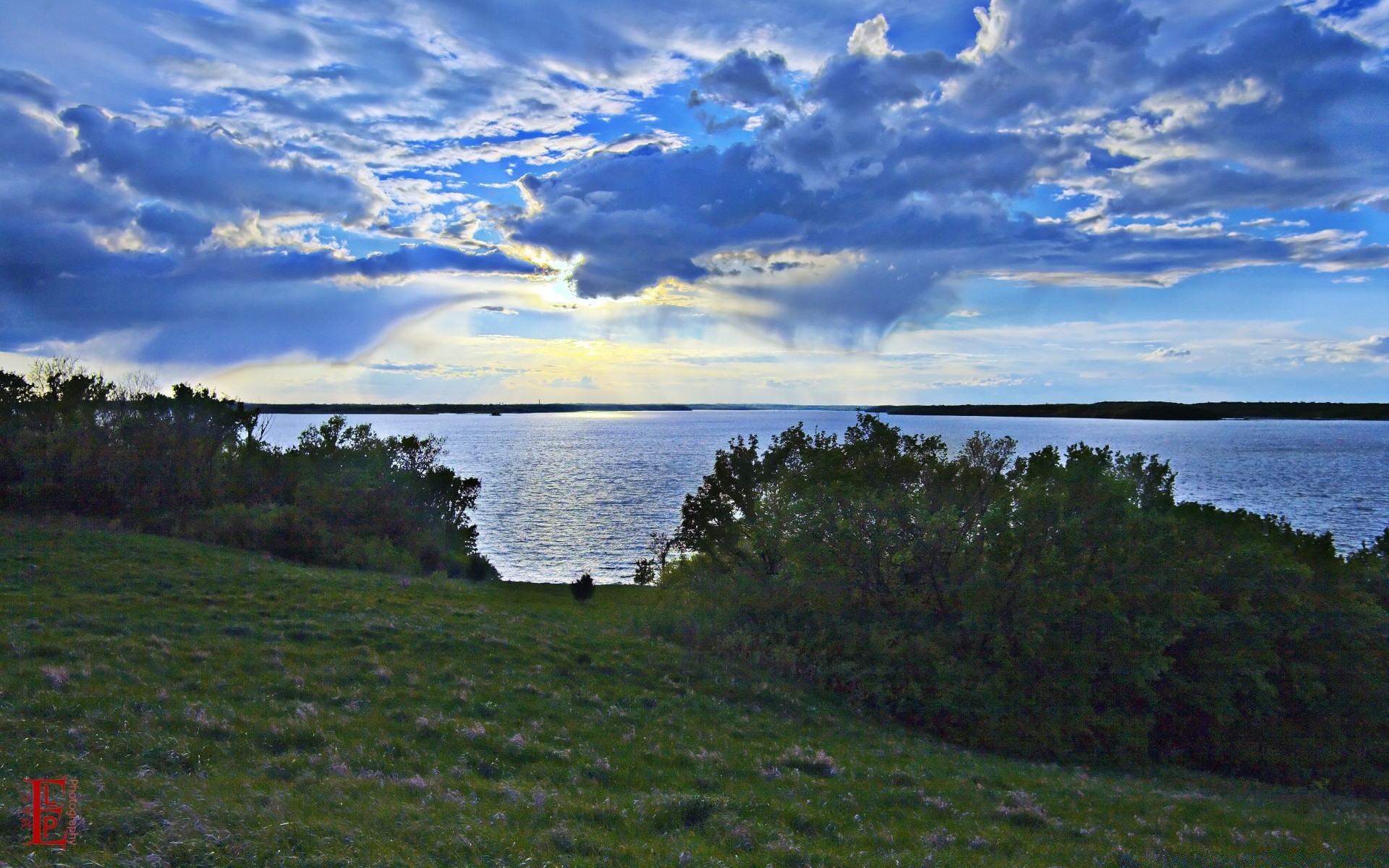 Puesta de sol en las nubes sobre el lago vista desde la colina
