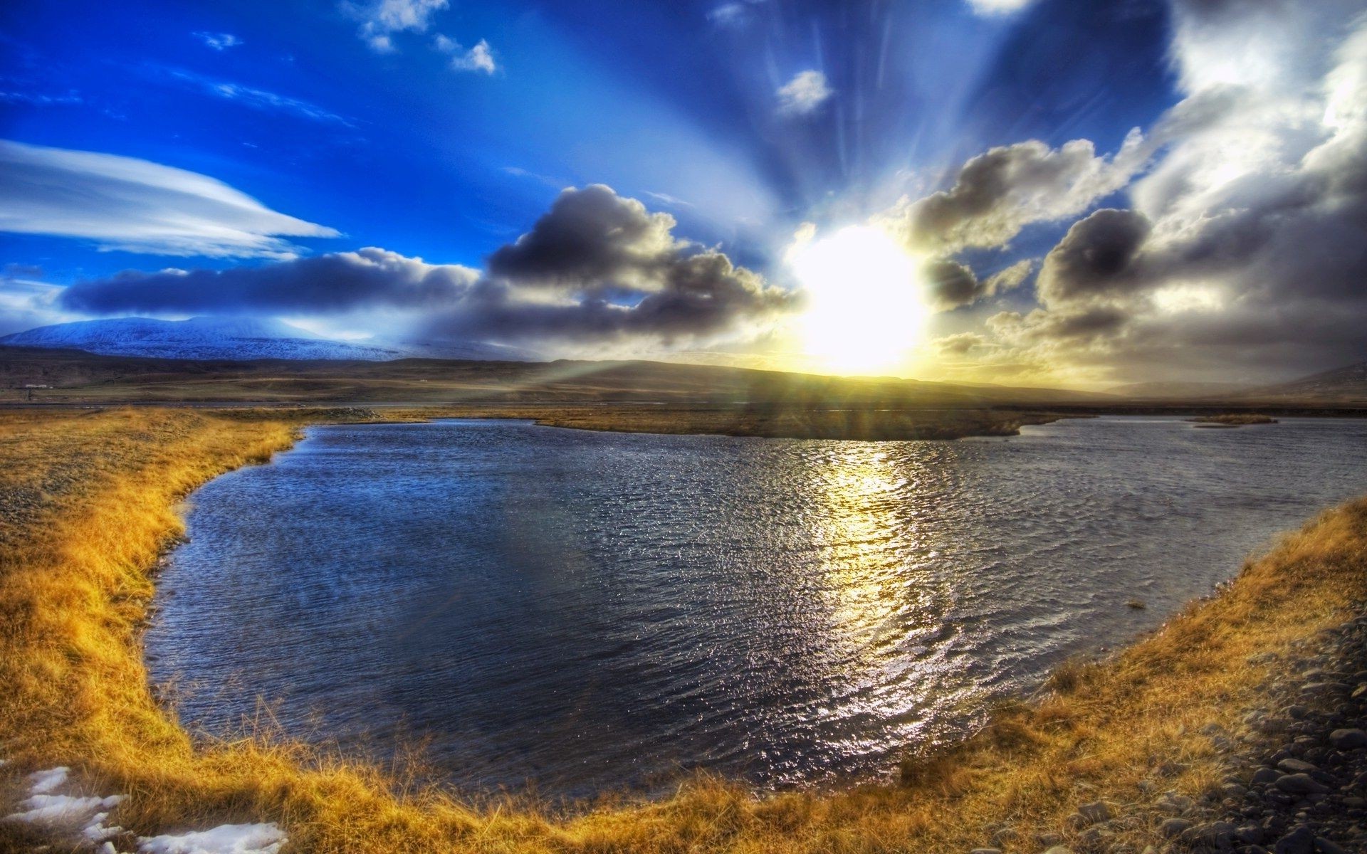 Hermosa puesta de sol a través de las nubes que se refleja en el lago