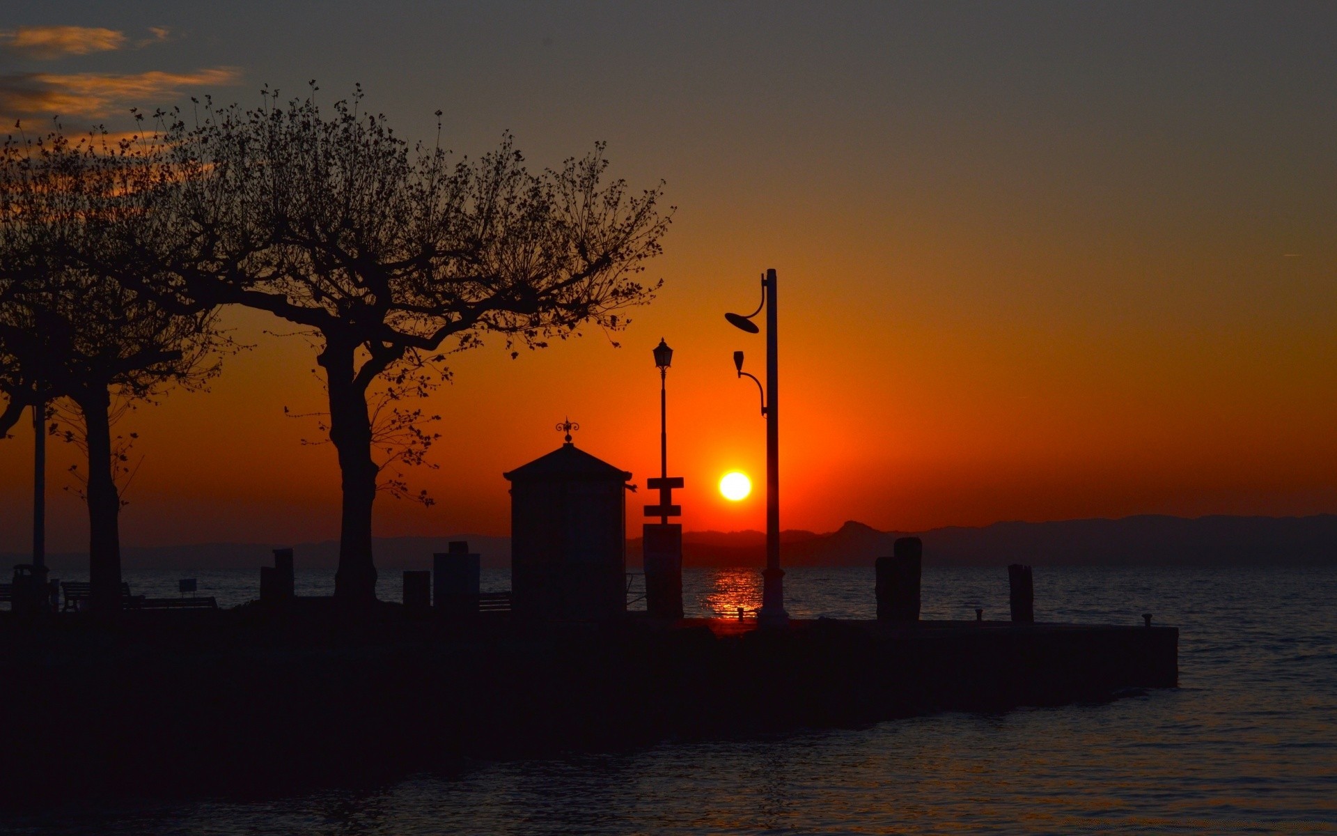 Puesta de sol azul sobre el lago. Crepúsculo junto al agua
