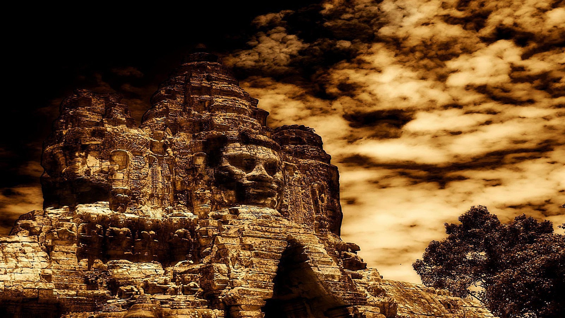 Arquitectura antigua. relieve de la cara en la roca. puesta de sol en ruinas antiguas